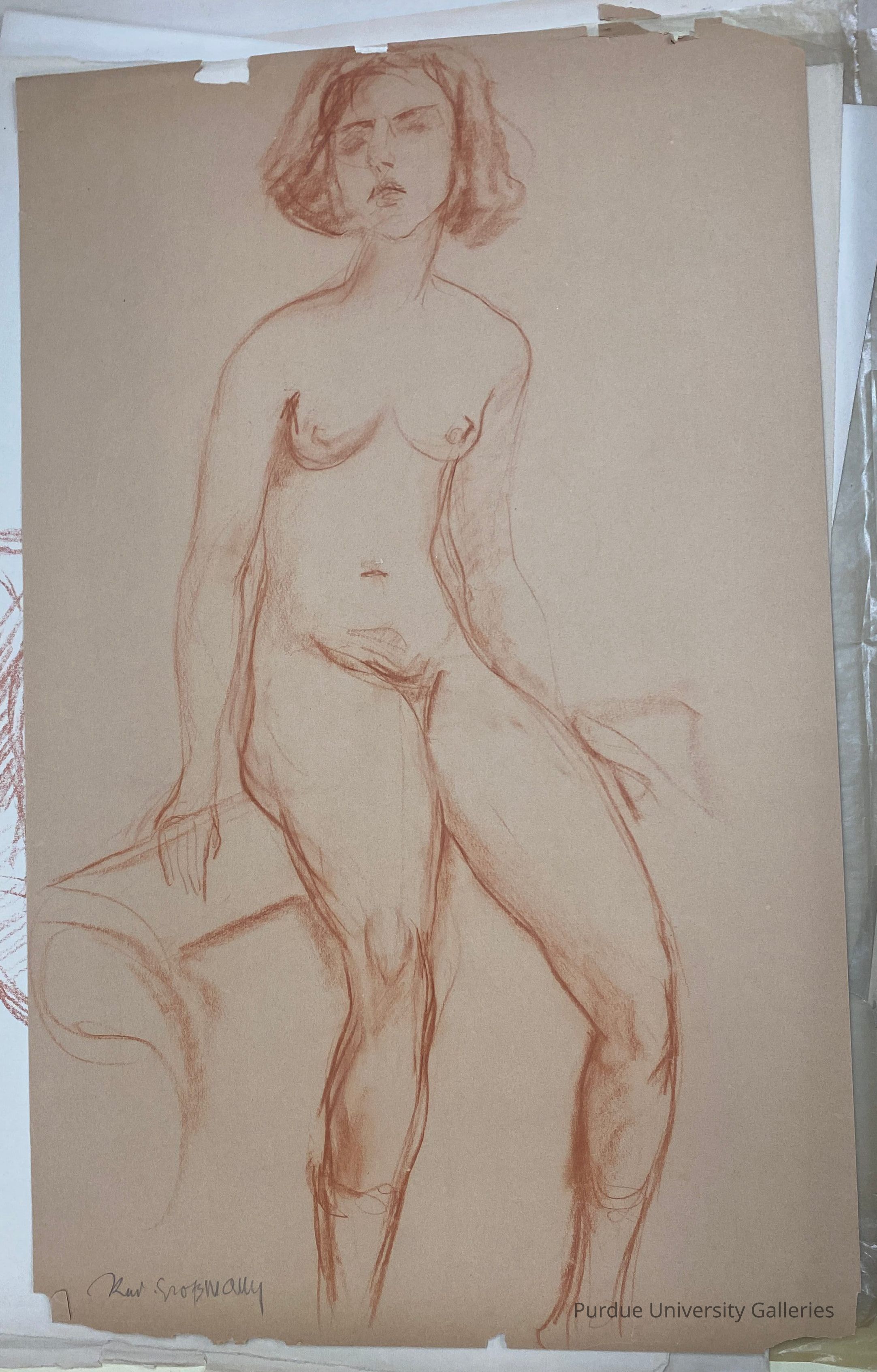 Red chalk study of a nude woman. Sketch of woman face on the back. On the back there's a faint black outline of another face, as if it'd been drawn on top of Purdue's print and bled through.Made/Created
