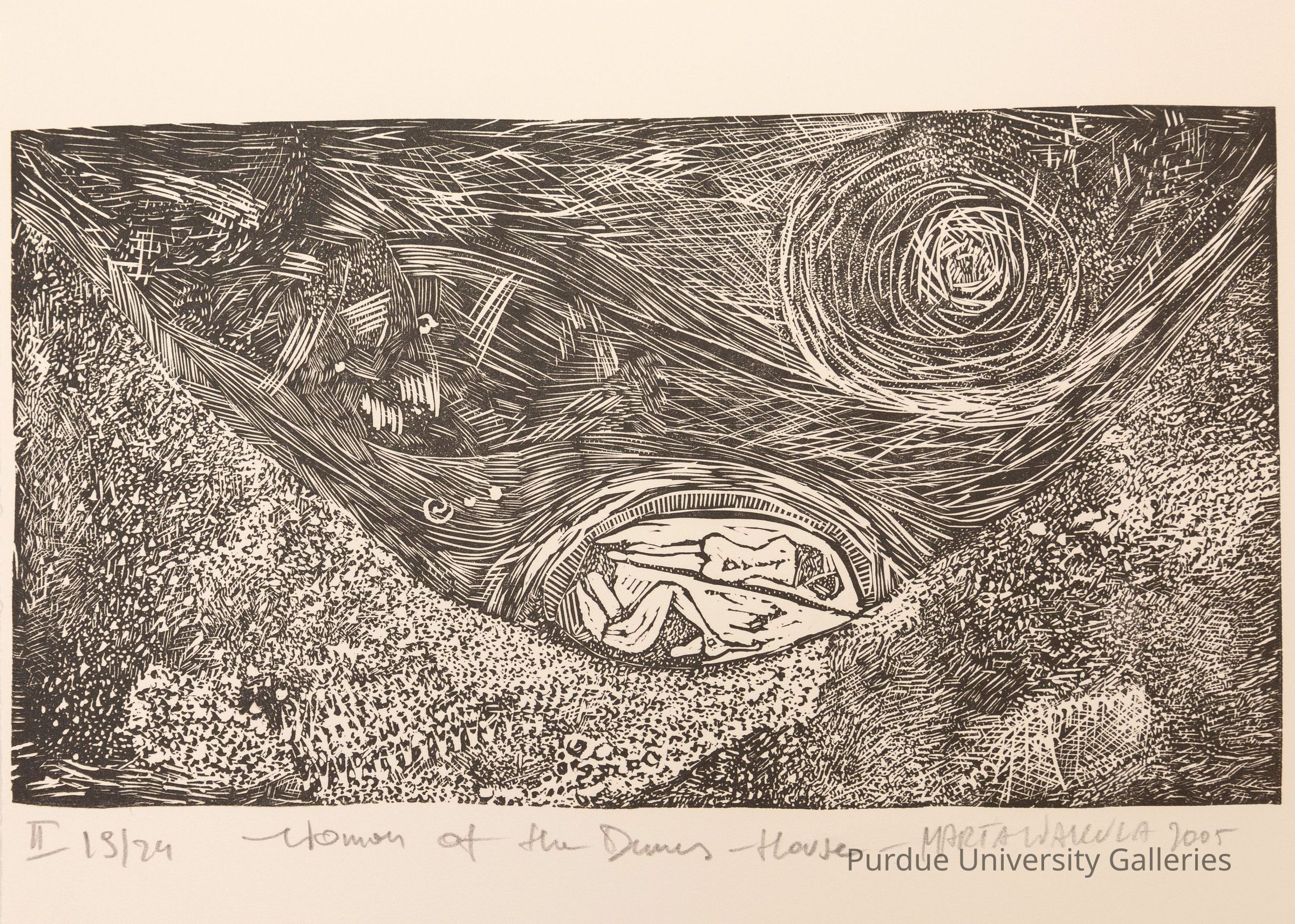 Print of two individuals lying in a seed-like pod and surounded by the earth and sky. Along the bottom of the print wirtten in pencil "II 19/24, Woan of the Dunes - House, Marta Wakula, 2005"Type of Print