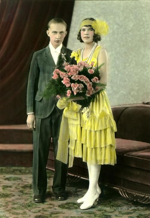 a yellow dress and yellow headpiece on a woman. A brown couch and curtain fill in the room for the photo. A man wears a green suit has he stands next to a woman.Exhibition
