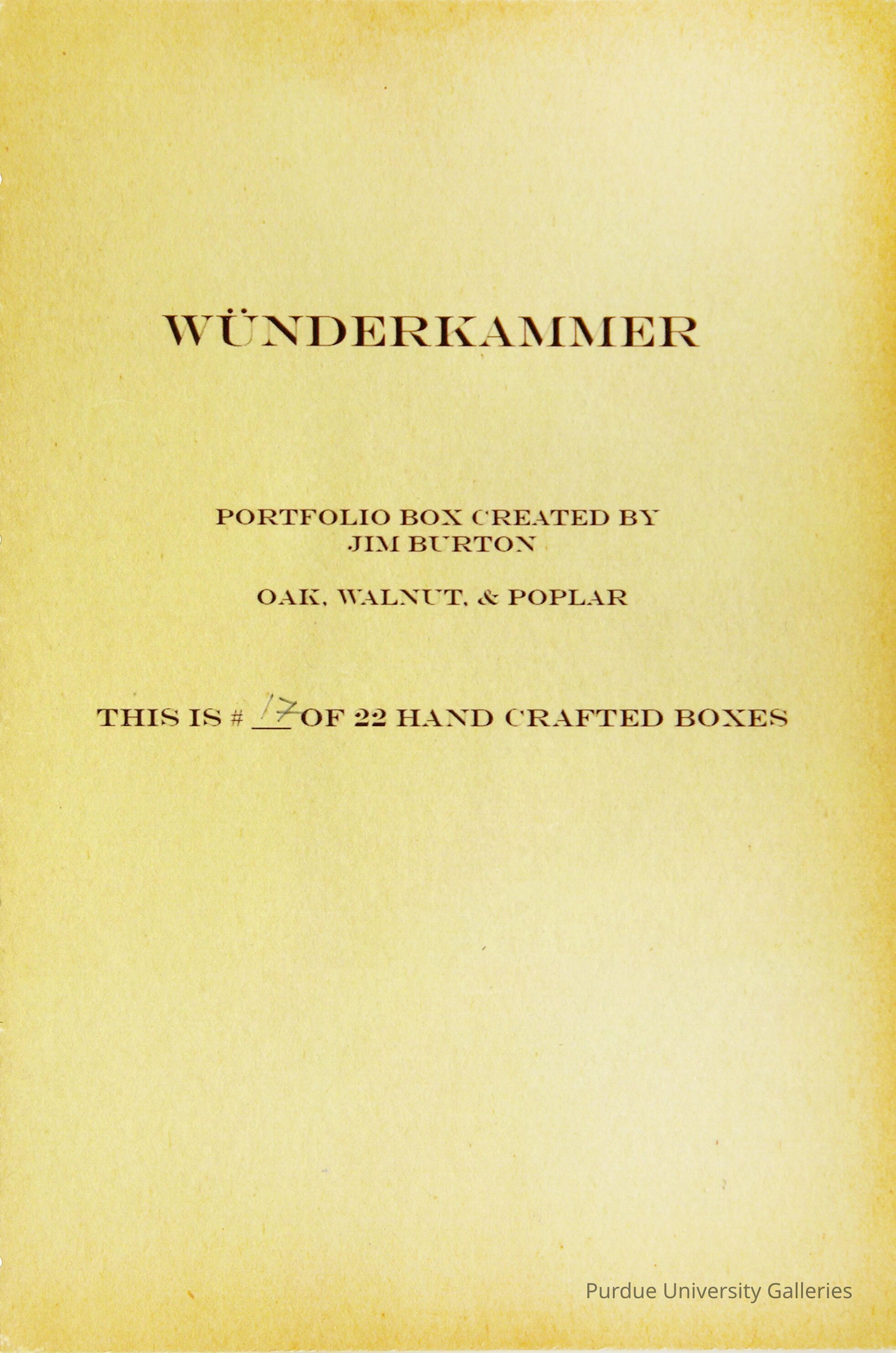 "Wünderkammer - The Wünderkammer portfolio is rooted in a Renaissance idea of collecting an assortment of objects that connect all aspects of human understanding This partitioned portfolio box holds three stacks of prints so that the dialog of the collaborative "triptych" changes as the images are seen in a variety of juxtapositions. This collection of prints aims to be an interactive microcosm in which the viewer participates in the "meaning" of the works by sorting diverse images in an experience that moves beyond the specific intentions and foresight of the artists. Curated and organized by Andrew DeCaen.