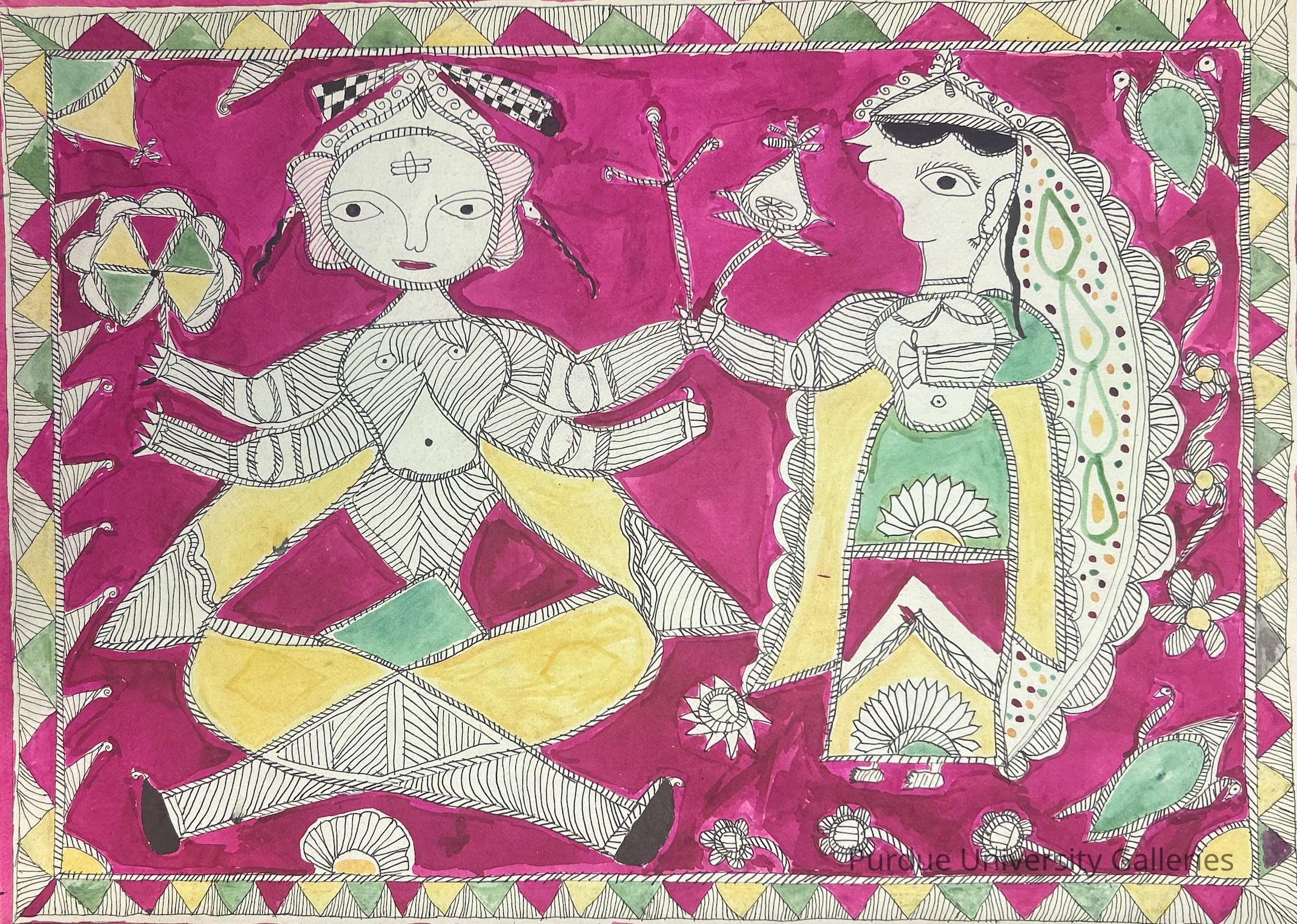Traditionally produced by women, Madhubani/Mithila paintings are identifiable by bright colors, geometric patterning, and two-dimensionality.Inscription/Signature/Marks