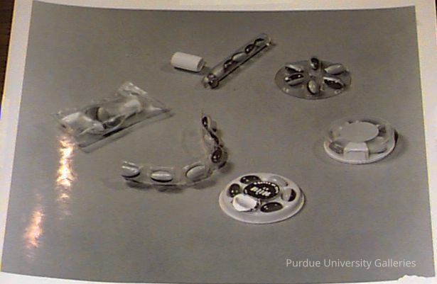Black and white photograph of pill blister packs, dispensers, containers, and pouches. On the back is written: "shelby de moss" "COMMERCIAL PHOTOGRAPHERS" "410 N. ST. JOSEPH AVENUE" "EVANSVILLE 12, INDIANA" "No. 57367" "ON REORDER GIVE ABOVE NUMBER"; there is also a box that says "DON DAILEY & ASSOCIATES" "123 LOCUST ST." "EVANSVILLE 8, IND.".Photograph Details