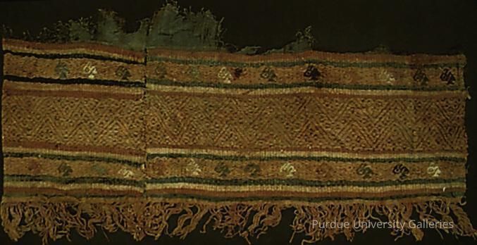 Textile fragment, brocaded border with bird motifs and attached fringe in gold, blue, white, and brown.Acquisition