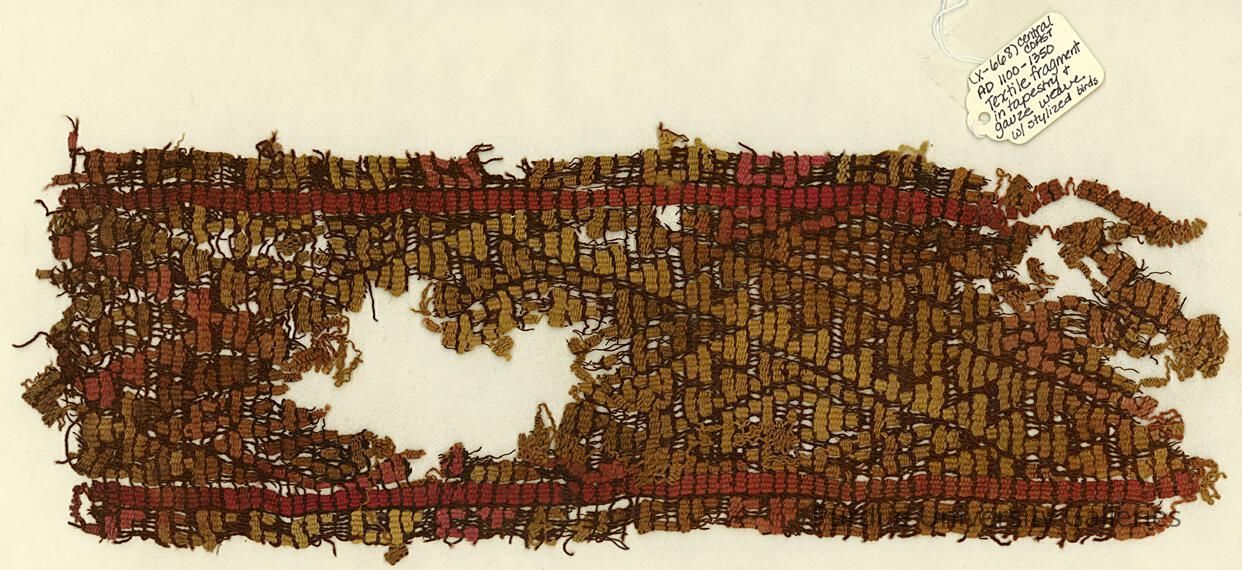 Textile fragment in tapestry and gauze weave, with stylized birds in yellows, reds, and brown.Acquisition