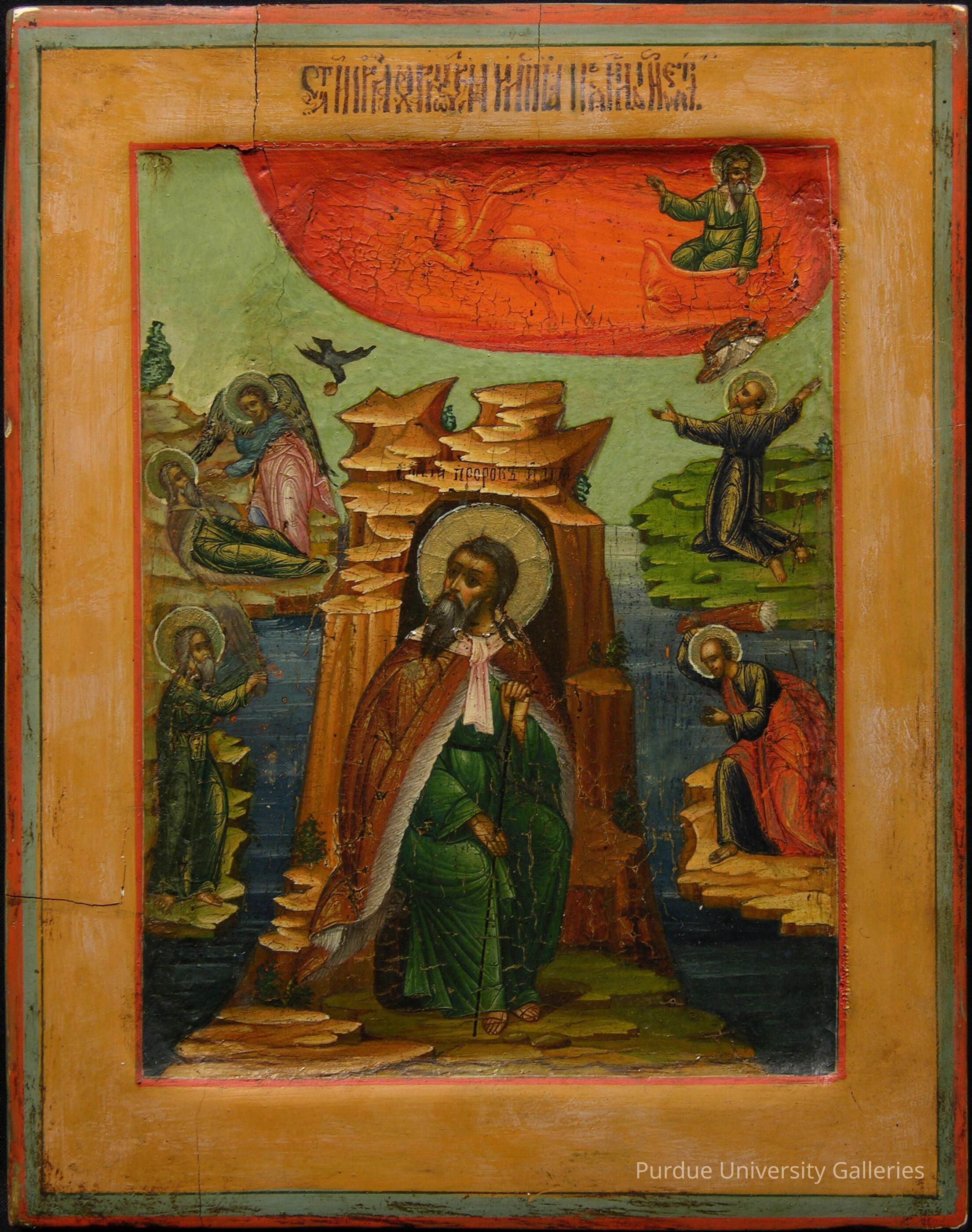 Tempera on flat wooden panel bordered in red, blue, and tan with white distressing. Black Cyrillic caption in the upper middle. The lowered image featured a red fiery streak with a red Pegasus pulling a grey bearded man in green robes in a chariot. Below, a grey bearded man in green robes and red and white cape sits on a stone throne with a black walking staff. On either side of the seated man are four different scenes on small bits of land around a lake.Type of Painting