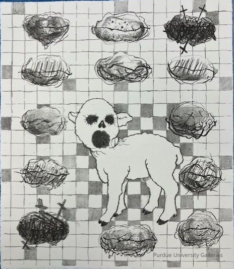 Black and white print with a lamb with hollow eyes and mouth in the center, surrounded by what appear to be rocks (13 total). The background is checkerboard with squares .75"x.75". Some have been filled in but most are blank.Made/Created