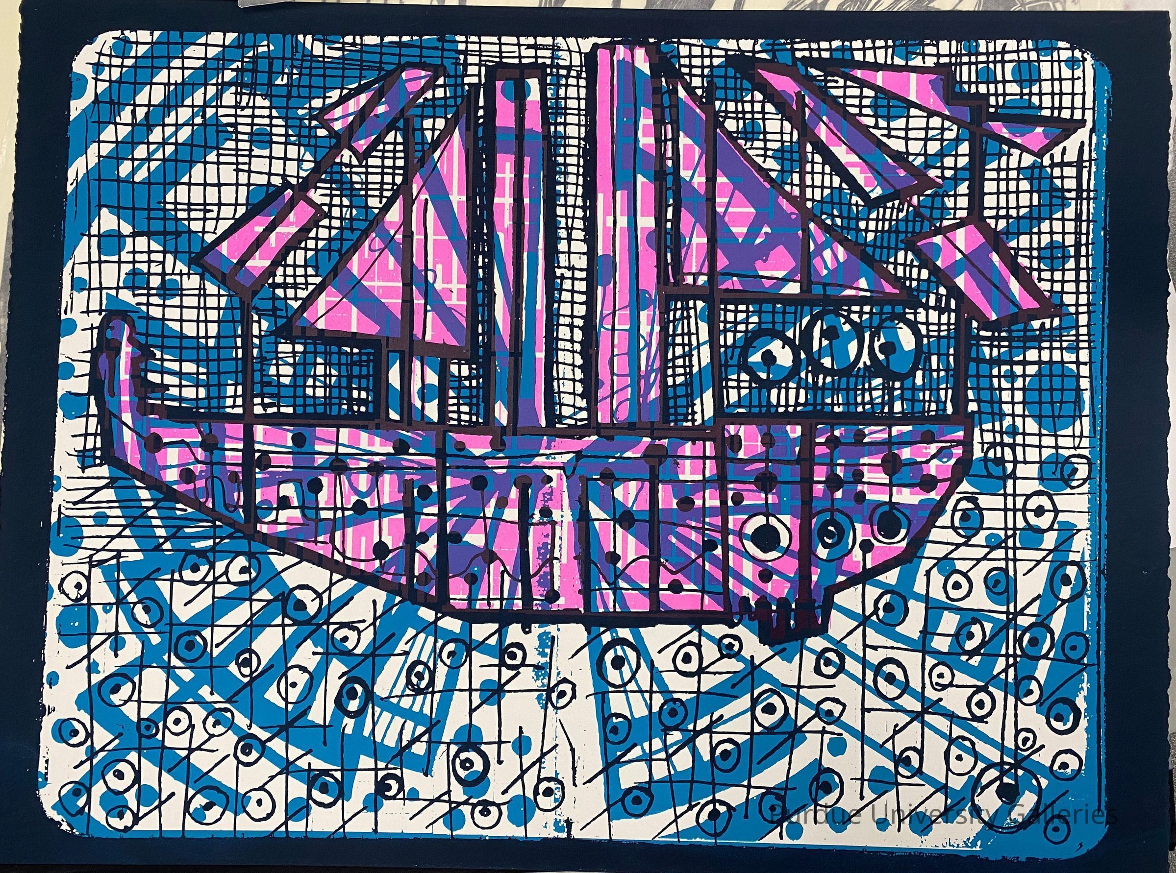 Abstract screen print of geometric shapes including black cross hatching and repeating eyeball-like circles surrounding a ship-like structure. Bright blue, neon pink, and black with navy blue border.Type of Print