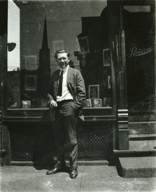 A man stands in front of Charles Pansirna's photography studio in Chicago. The man poses with one hand in his pocket and wears a casual suit with a tie. The studio has a big window displaying the variuos photographs in different frames and sizes.Photograph Details
