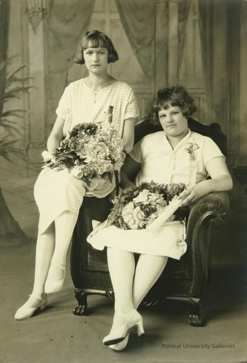 Two Young Ladies Sitting on Chair Holding Bouqets of Flowers and Rolled Papers (Diplomas?)Entry/Object ID