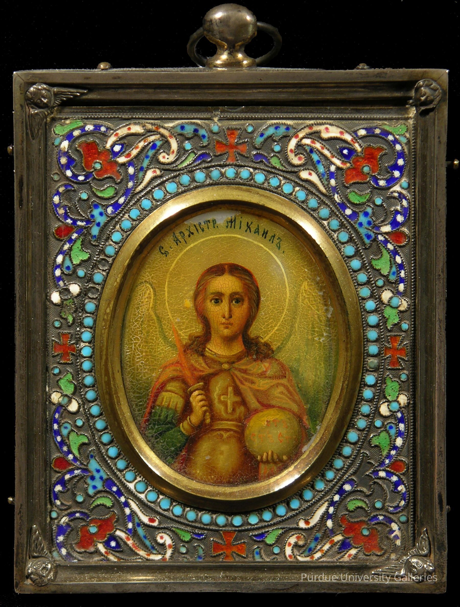 The icon portrays the Archangel Michael, chief captain of Heaven’s armies, who is shown with a sword, indicating his reputation as a warrior. In his other hand he holds an orb symbolizing worldly power. The artistic style is decidedly western, as the angel appears in a softly modeled form instead of a more two-dimensional manner characteristic of the Byzantine manner. This small, metal-framed type of icon became popular in the 18th and 19th centuries because of its durability and portability. Other works by the same artist who made this icon can be found in the state museums of Russian art in Moscow, St. Petersburg, and Rostov.