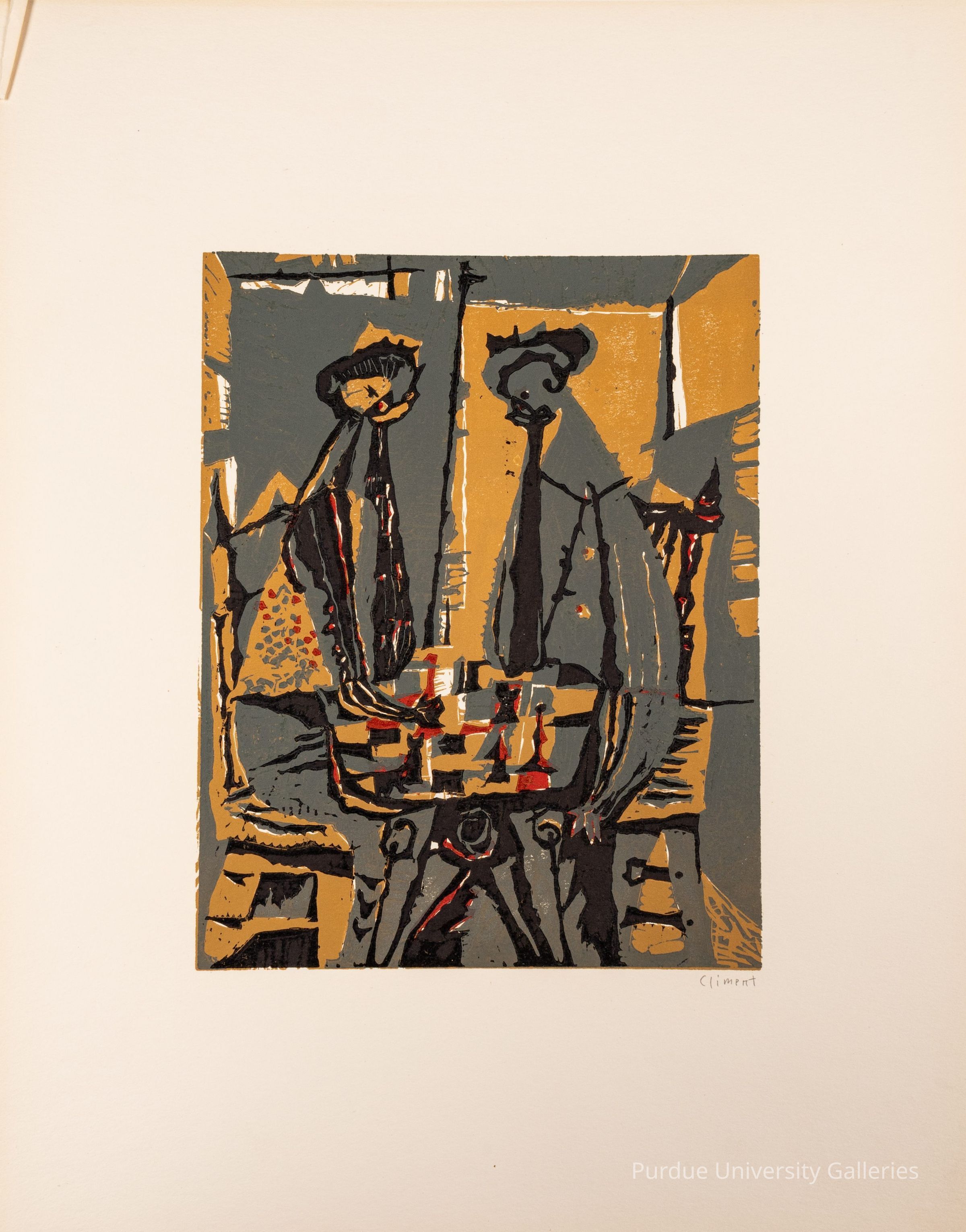 This scene has abstract shapes implying to be figure. There are colors of gray, tan, red and black creating shadow and outline. There are two figures playing implied chess with the red and black checker print.Type of Print
