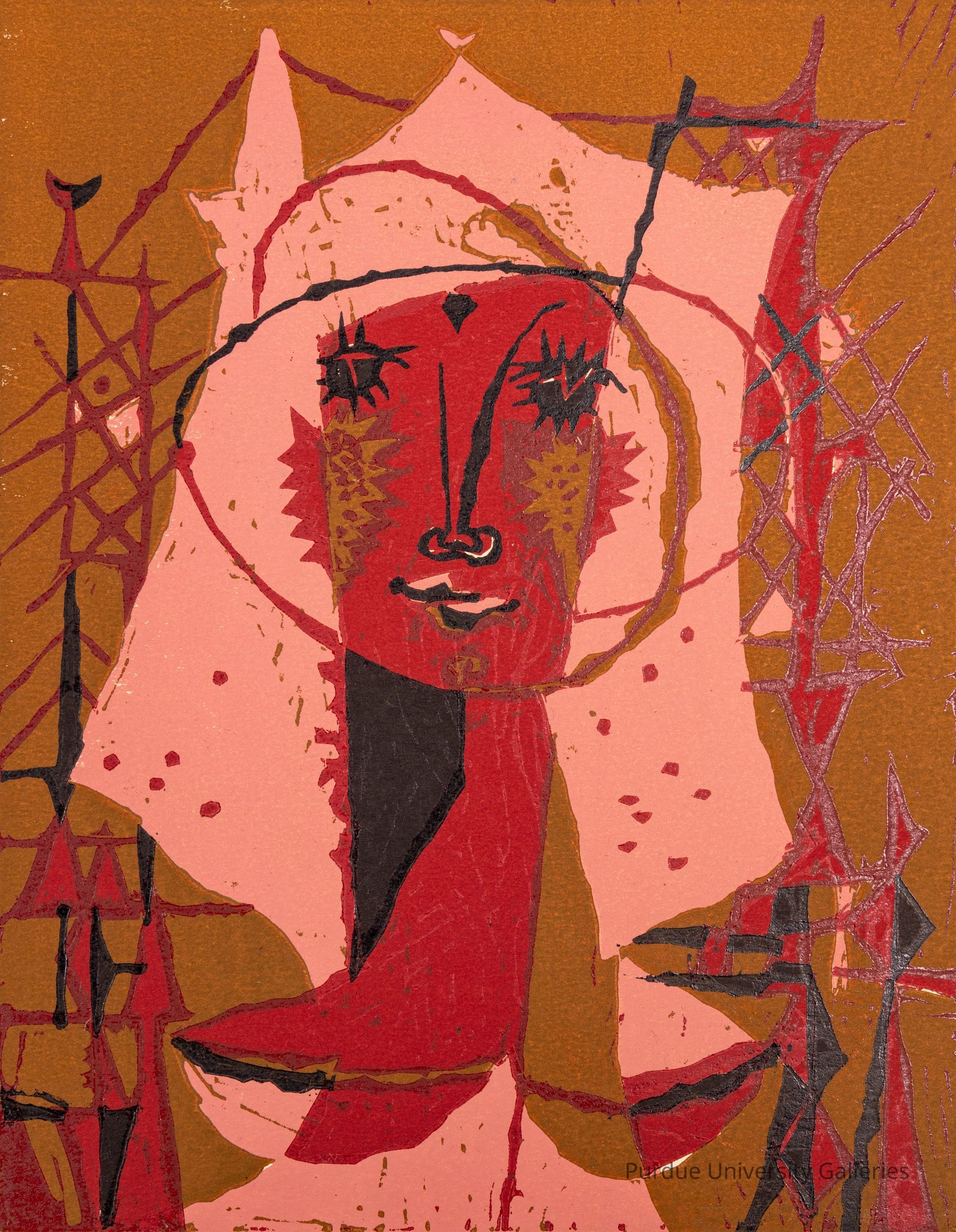 Multicolor print linocut of an abstract face with geometric shapes and marks surrounding it.Type of Print