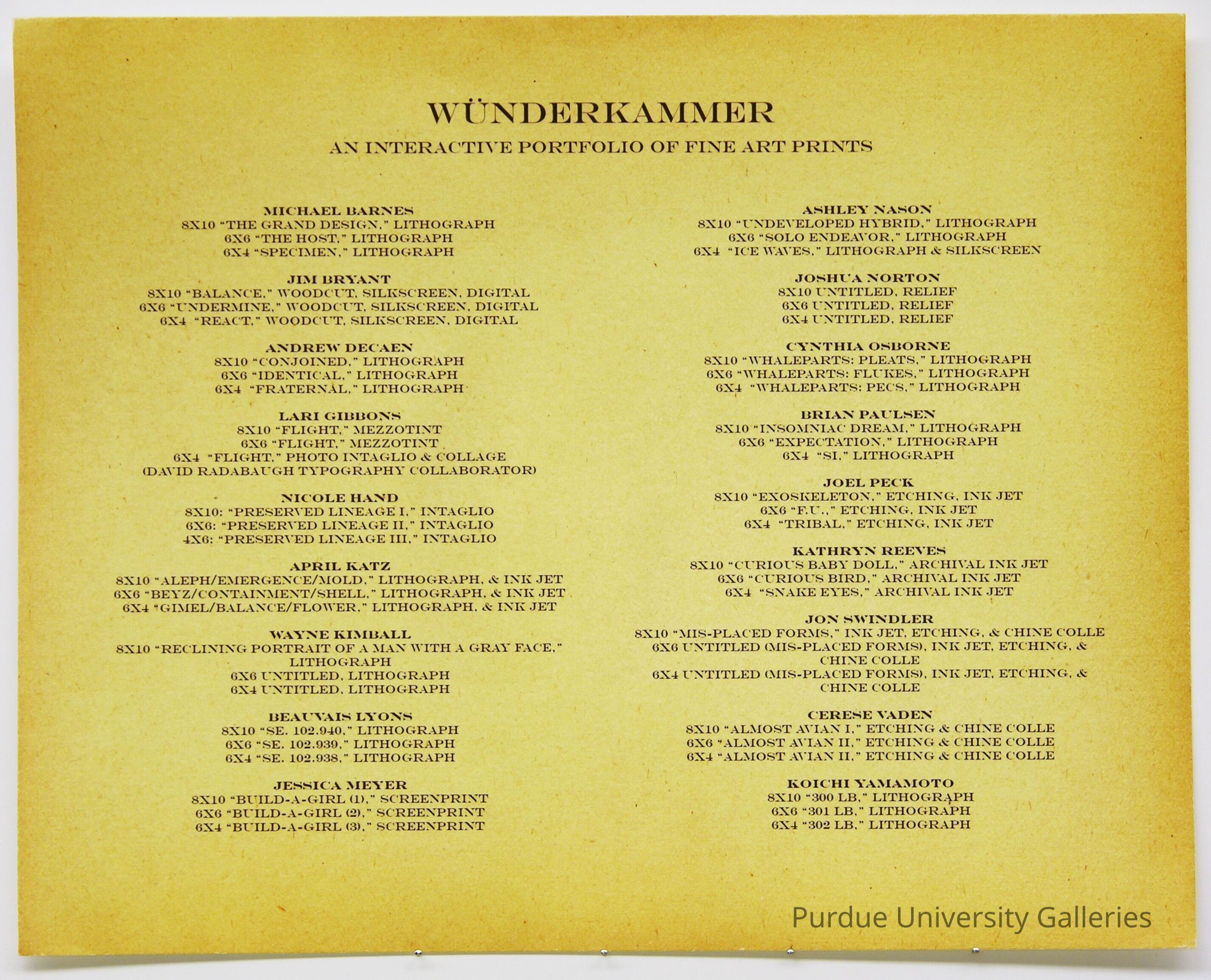 "Wünderkammer - The Wünderkammer portfolio is rooted in a Renaissance idea of collecting an assortment of objects that connect all aspects of human understanding This partitioned portfolio box holds three stacks of prints so that the dialog of the collaborative "triptych" changes as the images are seen in a variety of juxtapositions. This collection of prints aims to be an interactive microcosm in which the viewer participates in the "meaning" of the works by sorting diverse images in an experience that moves beyond the specific intentions and foresight of the artists. Curated and organized by Andrew DeCaen.