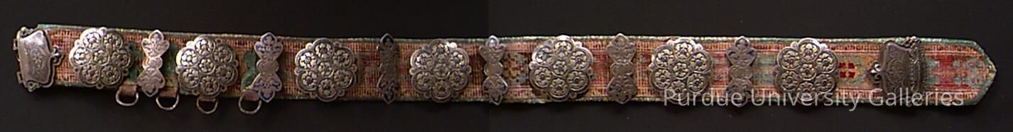 "Silver Khan’s Belt with niello and blue enamel decorations on fabric and leather. Niello is a black alloy of silver, copper, lead, and sulfur. The decorated metal piece is engraved or etched with a design. The recesses are filled with the ground alloy which is melted into the depression.