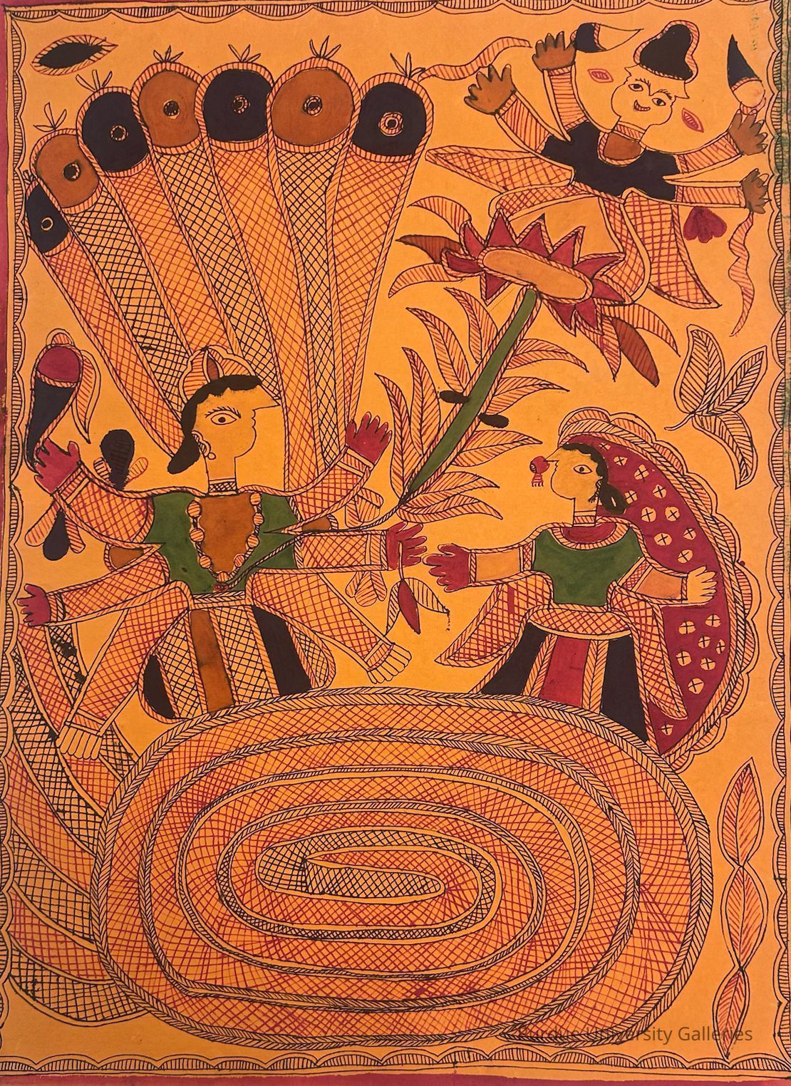 Traditionally produced by women, Madhubani/Mithila paintings are identifiable by bright colors, geometric patterning, and two-dimensionality.Inscription/Signature/Marks