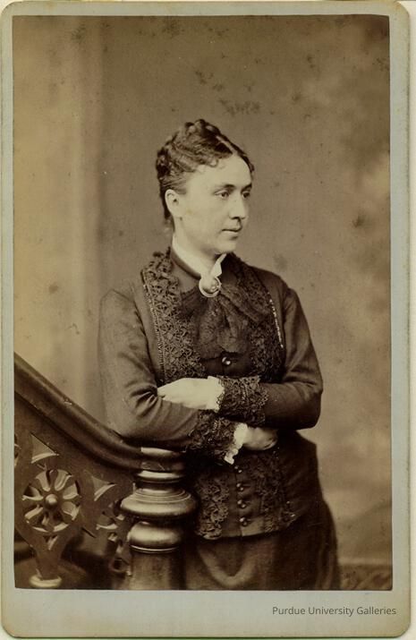 James Wallace Black (1825-1896), known professionally as J.W Black was an early American photographer whose career was marked by experimentation and innovation. Born in New Hampshire, we moved to Boston to try to be a painter and turned to photography there after. A woman in a lace dress, leans against a stair case banister with her arms crossed. She looks towards the right side of the photograph, in profile view.
