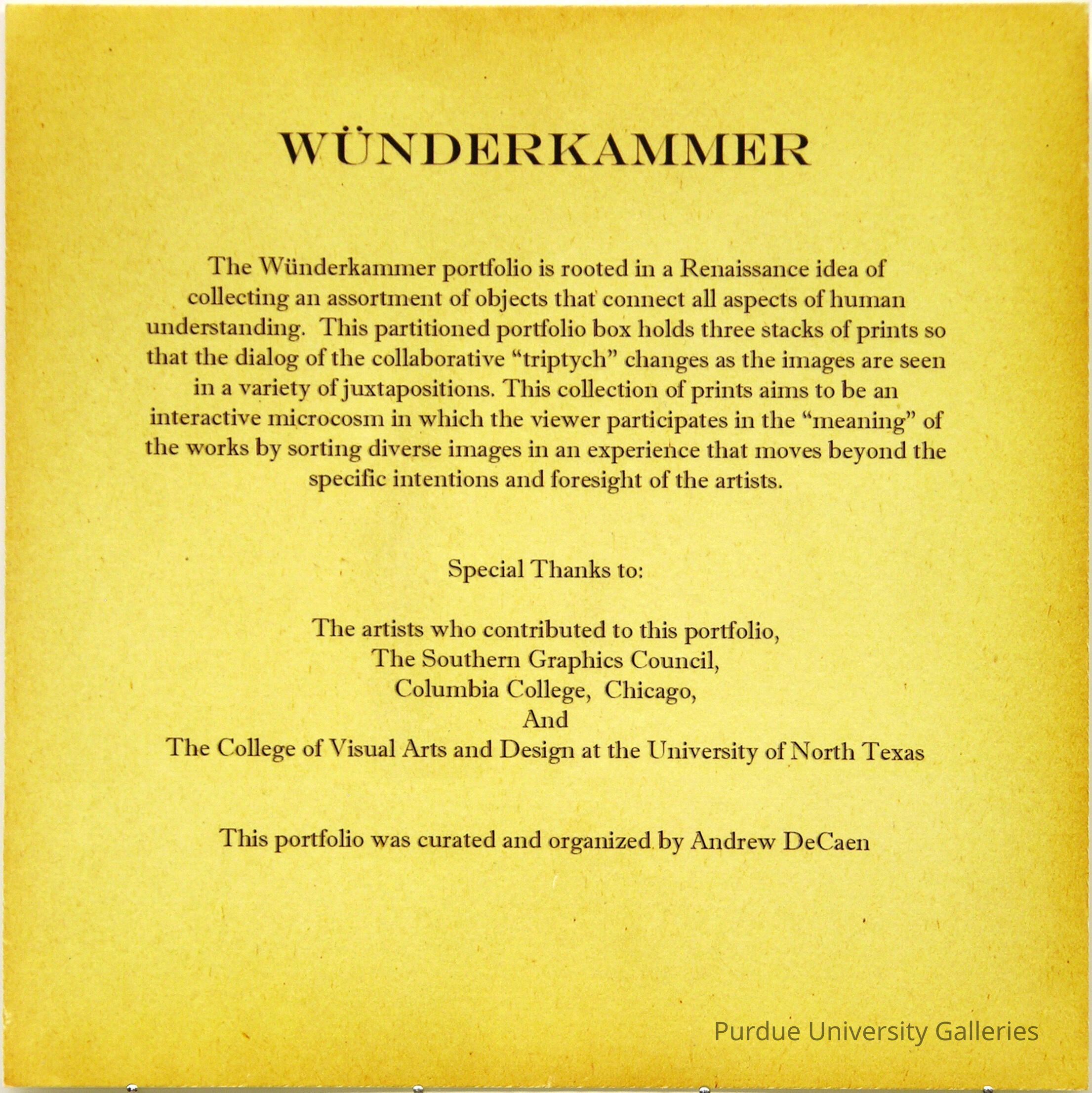 "Wünderkammer - The Wünderkammer portfolio is rooted in a Renaissance idea of collecting an assortment of objects that connect all aspects of human understanding This partitioned portfolio box holds three stacks of prints so that the dialog of the collaborative "triptych" changes as the images are seen in a variety of juxtapositions. This collection of prints aims to be an interactive microcosm in which the viewer participates in the "meaning" of the works by sorting diverse images in an experience that moves beyond the specific intentions and foresight of the artists. Curated and organized by Andrew DeCaen.