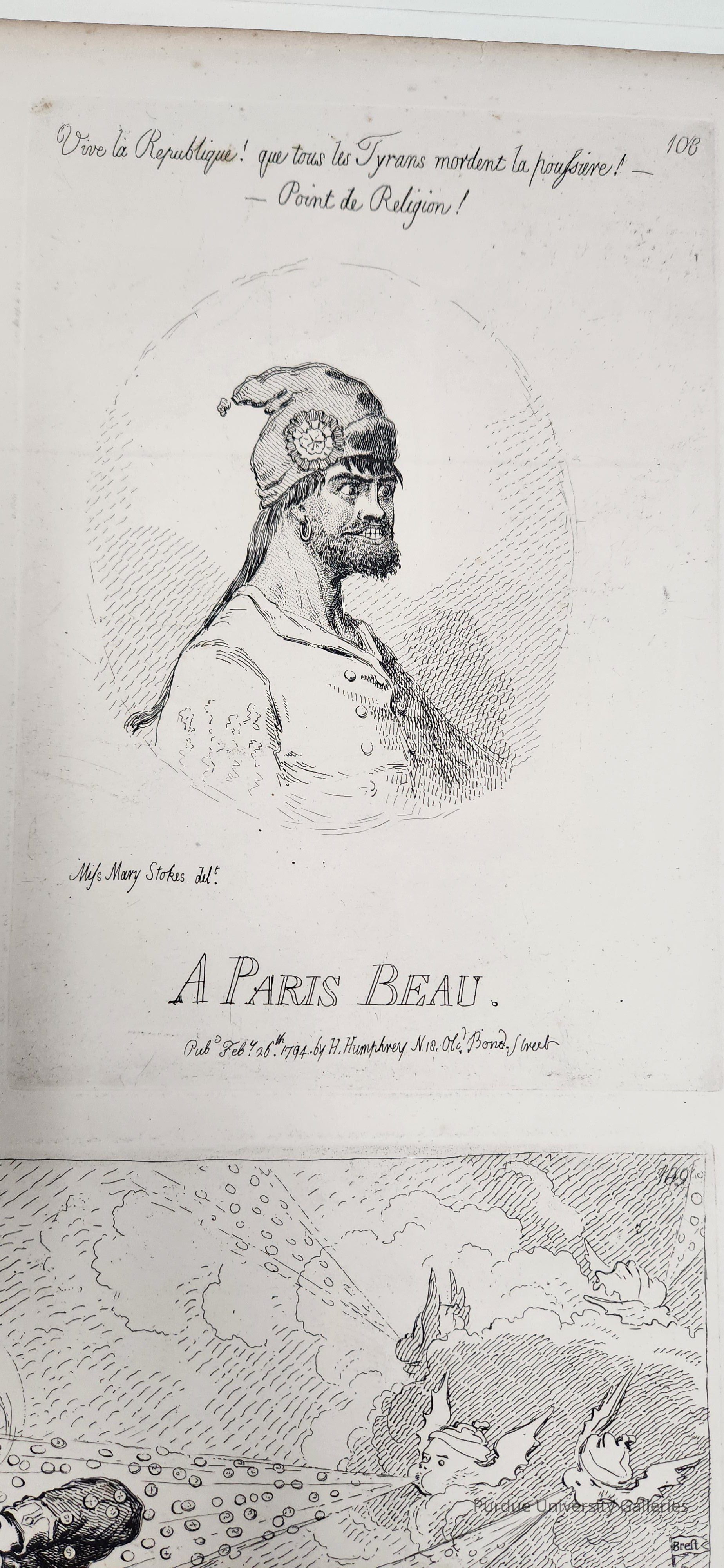 Left image on folio recto with "A Paris Belle" (1994.33.03b) on left and "A French Hail Storm, ...or... Neptune loosing sight of the Brest Fleet" (1994.33.03d) on lower register. Blue and Buff Charity; or The Patriarch of the Greek Clergy applying for Relief (1994.33.03a) on verso.
