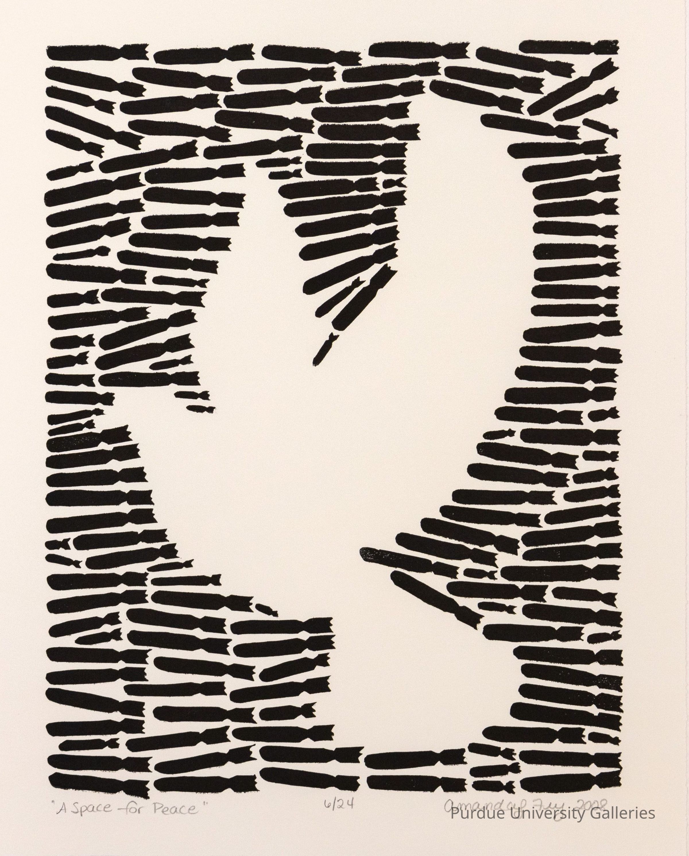 Image of white dove created using black bomb/torpedos. Along the bottom in pencil "A Space for Peace, 6/24, Amanda L. Fry, 2008"Acquisition