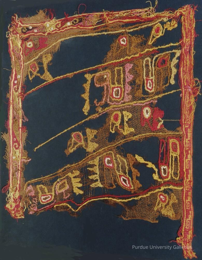 Textile fragment, with bird motifs in red, pink, yellow, white, and browns, embroidered on brown cotton gauze ground. Supplementary weft border.Acquisition