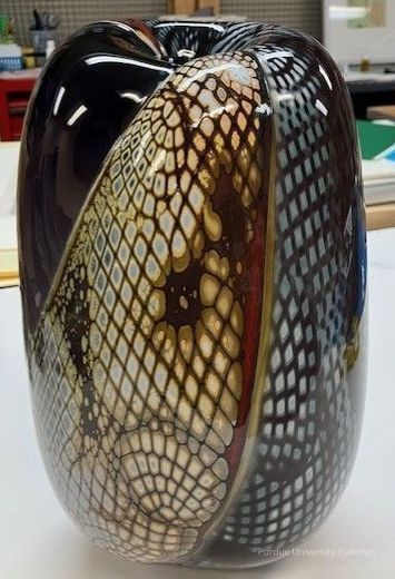 Hand blown, glass vase with multiple colors and patterns. Circular form which has a narrow base which moves outward in a bulbous fashion and moves upward toward the neck which is rounded downward into a 1" wide, round hole.Type of Sculpture
