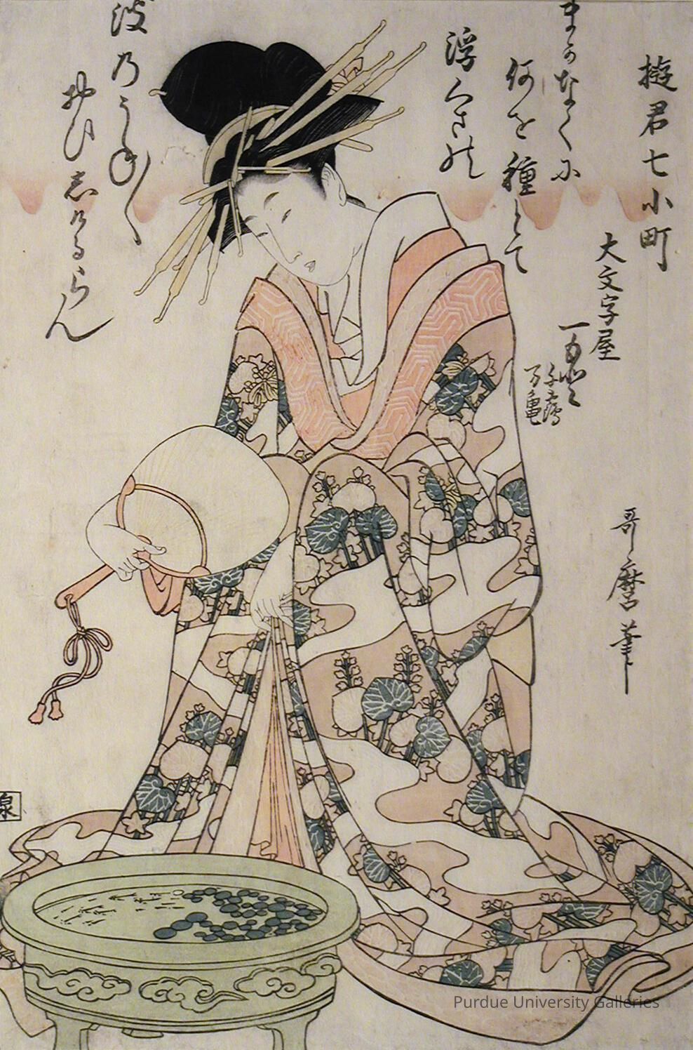 For over two hundred years, 1640 to 1853, the ports of Japan were virtually closed to the outside world. During this period of isolation a unique and technically unrivaled art emerged--the Ukiyo-e woodblock print. Ukiyo-e, “pictures of a floating world,” evolved to meet the demands of a rising merchant class for an an that reflected its own interests and amusements. The subjects depicted were Kabuki theater, famous courtesans, genre scenes and famous sights.