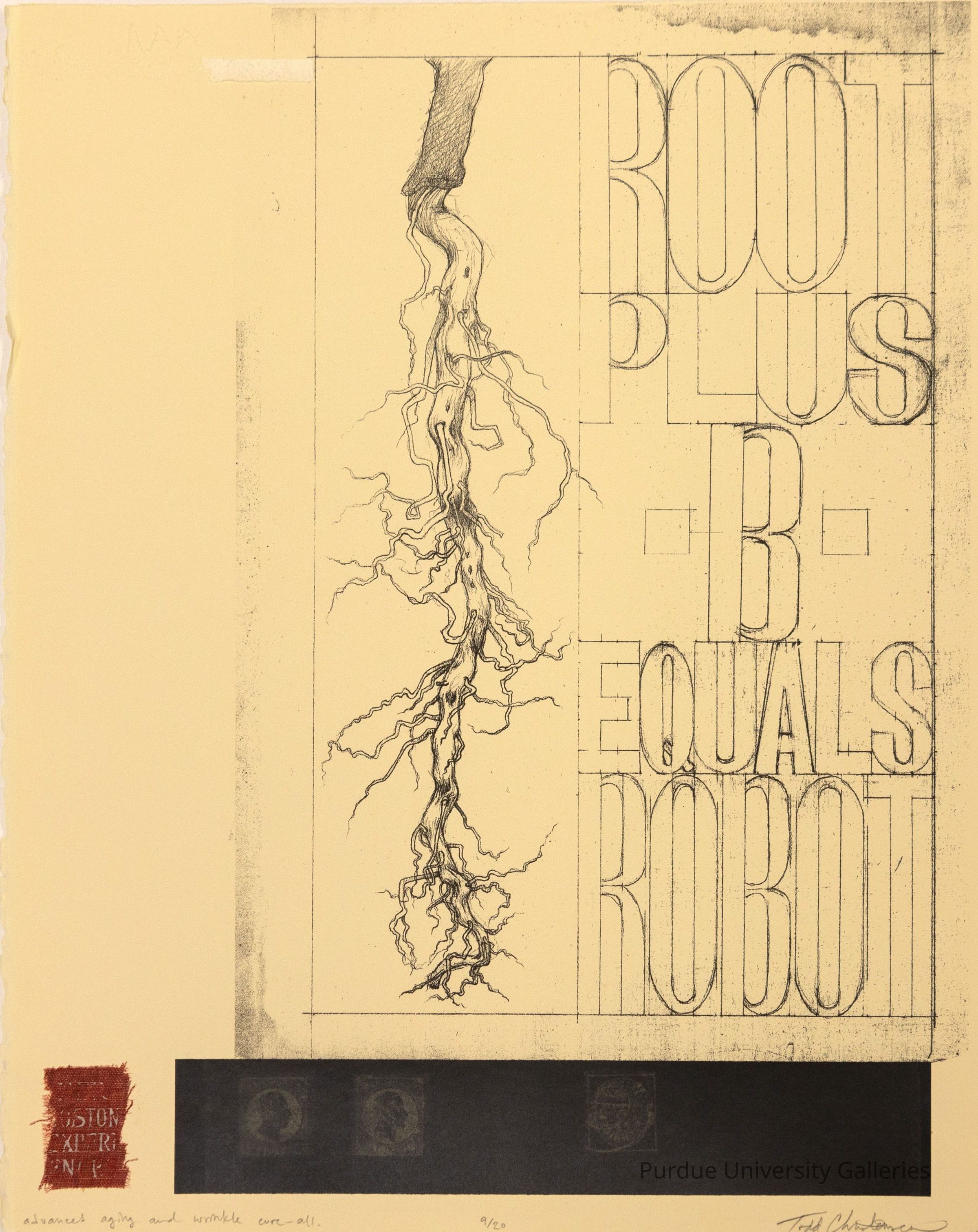 Transfer and collage print using 2/3 right side of paper entitled "ROOT PLUS -B- EQUALS ROBOT" to the far right side. Opposite this is image of a plan'ts root system. Below thie image with a black background are images of 3 coins. To the left of this is a red buckram material with letters stamped or cut out "(illegible) BOSTON EXPERT (illegible) measuring 1" W x 1 1/2" H.