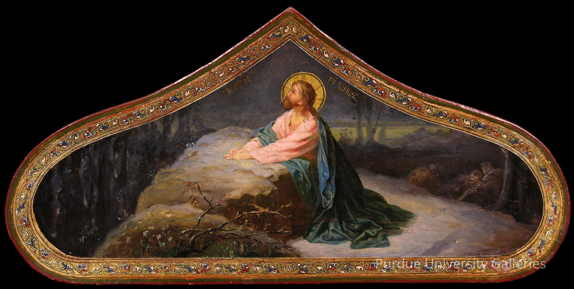 The shape of this icon suggests that it may have been placed above the doors of an iconostasis. The subject is the Agony in the Garden, in which Jesus retreats to a grove of olive trees called Gethsemane, taking with him Peter, James, and John, who appear in the shadows of the icon to the right of Jesus. Jesus has fallen to the ground in prayer beside a rock, where according to Luke’s account an angel comes to strengthen him. The icon was executed in a western artistic style, visible in the softly modeled figure of Christ, the looseness of the artist’s brushstrokes, and the romanticized atmosphere of the work. Framing the icon is intricately interlaced scrollwork of blue, red, white, and green.