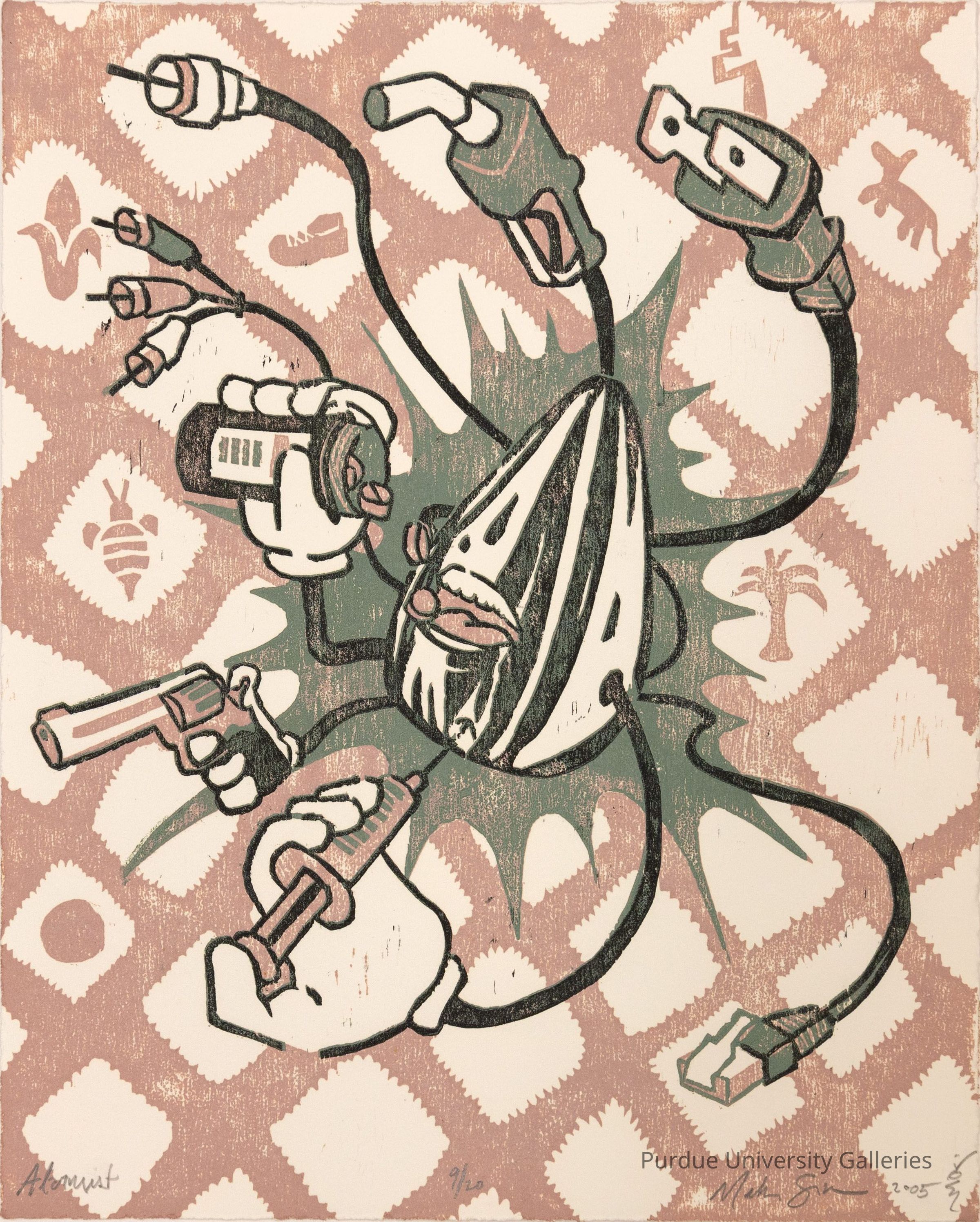 Relief print of a seed or nut-like creature with multiple cords extending from its body as appendages. These link to various modern amenities such as a plug, computer cables, a gasoline pump handle. Three hands also extend out and each is holding a pill bottle (dispensing into the mouth of the creature), a revolver and a syringe (injecting into creature's body). This image is stamped over a checked patterned background which has an ear of corn, a shoe, a dog, a bee and a palm tree located inside the squares. Along the bottom edge of the paper in pencil is written, "Alarmist, 9/20, Mike Srsen, 2005"Type of Print
