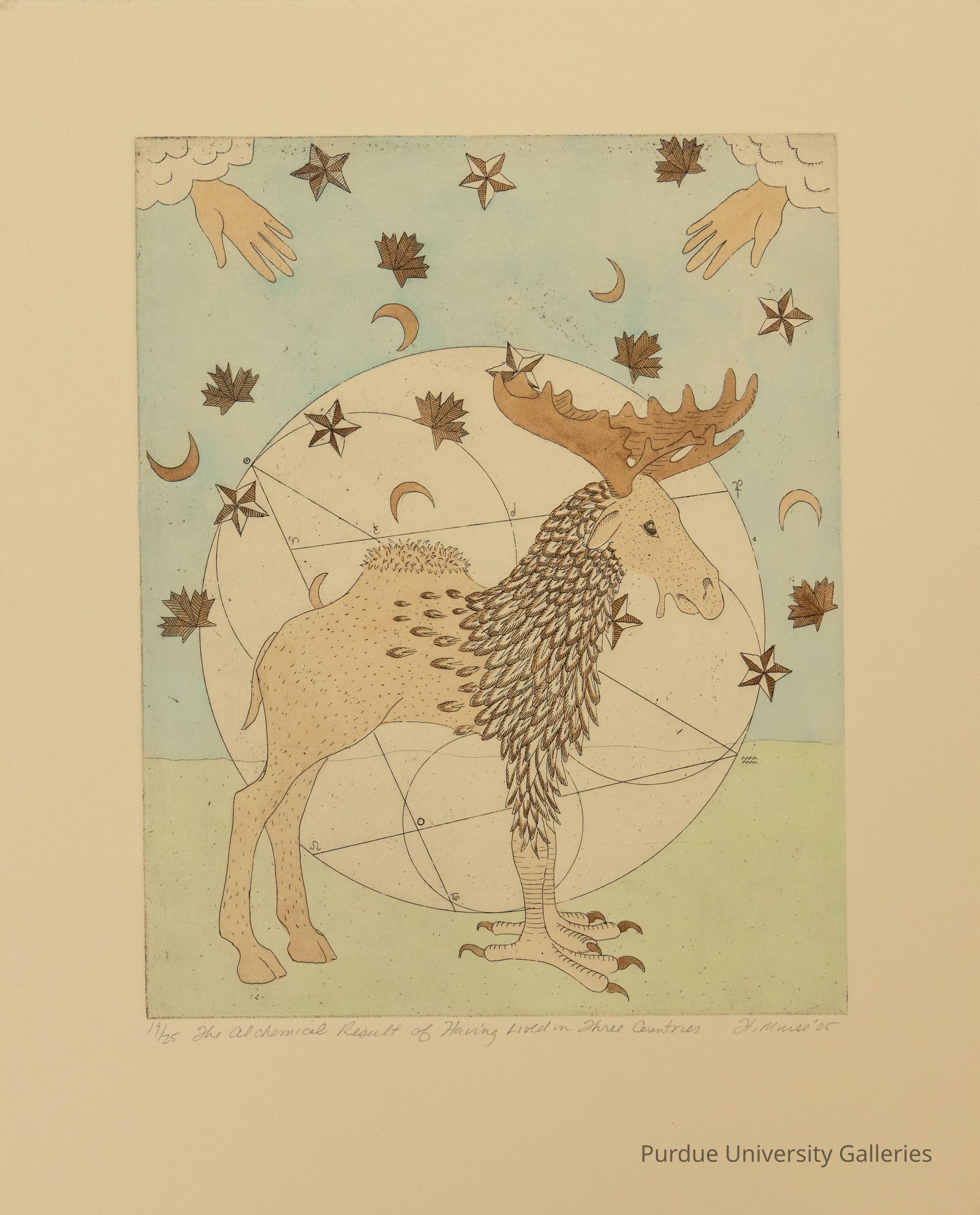 Print of a animal composed of a camel (body and back legs), eagle (neck and front legs), and the head of a moose. The beast is surrounded by leaves, stars and half-moons with hands coming out of the clouds in the top corners. the back ground is a light blue and the foreground is a light green. A sphere is behind the beast. Below the print in pencil "19/25, The Alchemical Result of Having Lived in Three Centuries, H. Muse, '05"Collection