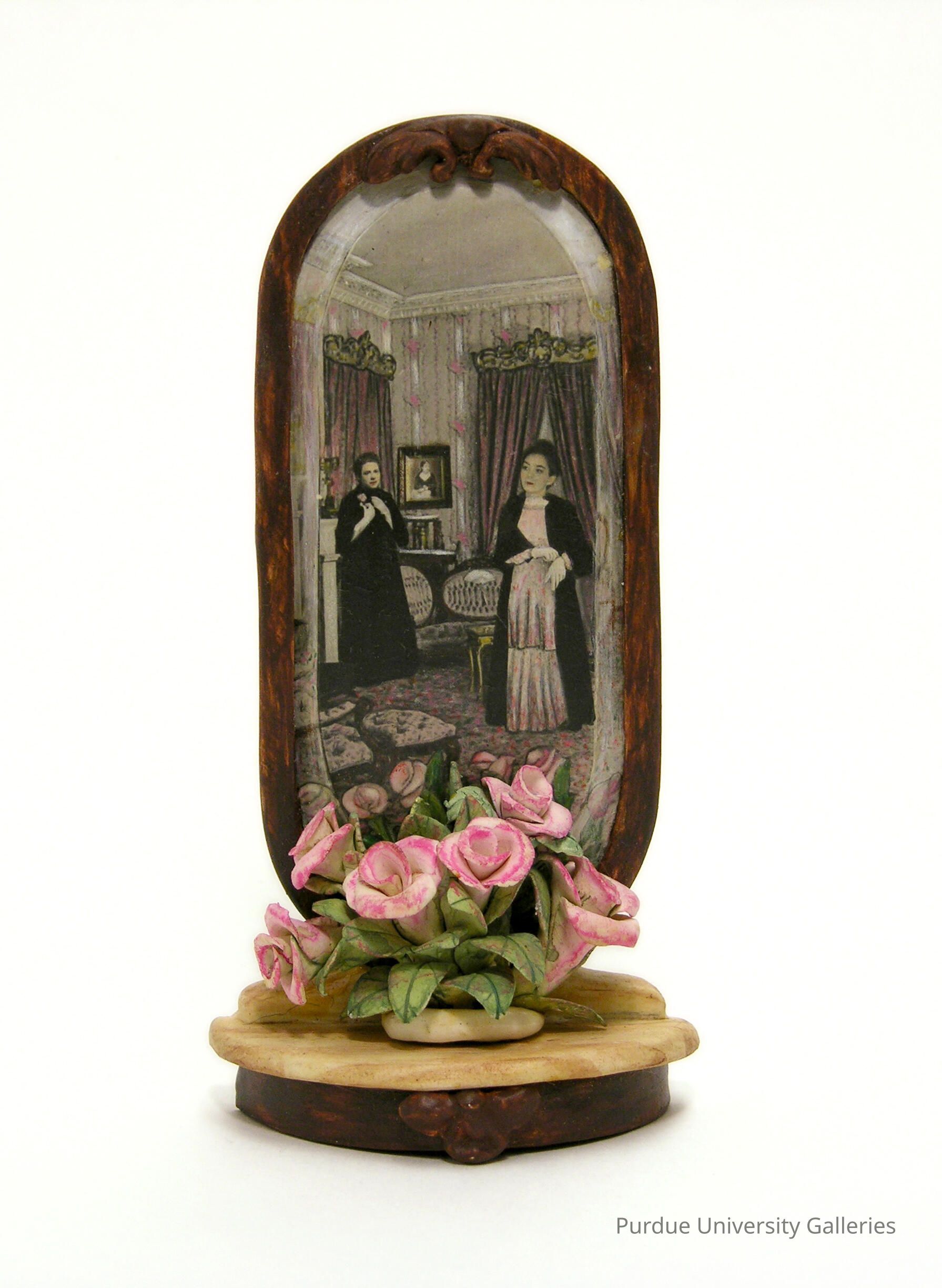 Mitchell’s diminutive work takes the form of a Victorian stand mirror with an arrangement of delicate pink flowers. Reflected in the mirror’s surface is the room in which the mirror presumably sits - an ornately decorated sitting room. In the room are the figures of two women, a mother and daughter. On the wall is an image of yet another woman, possibly the women’s mother and grandmother. Mitchell creates a visual record of three generations of women and speaks to the special connection that mothers and daughters share, passing maternal knowledge down through the generations.