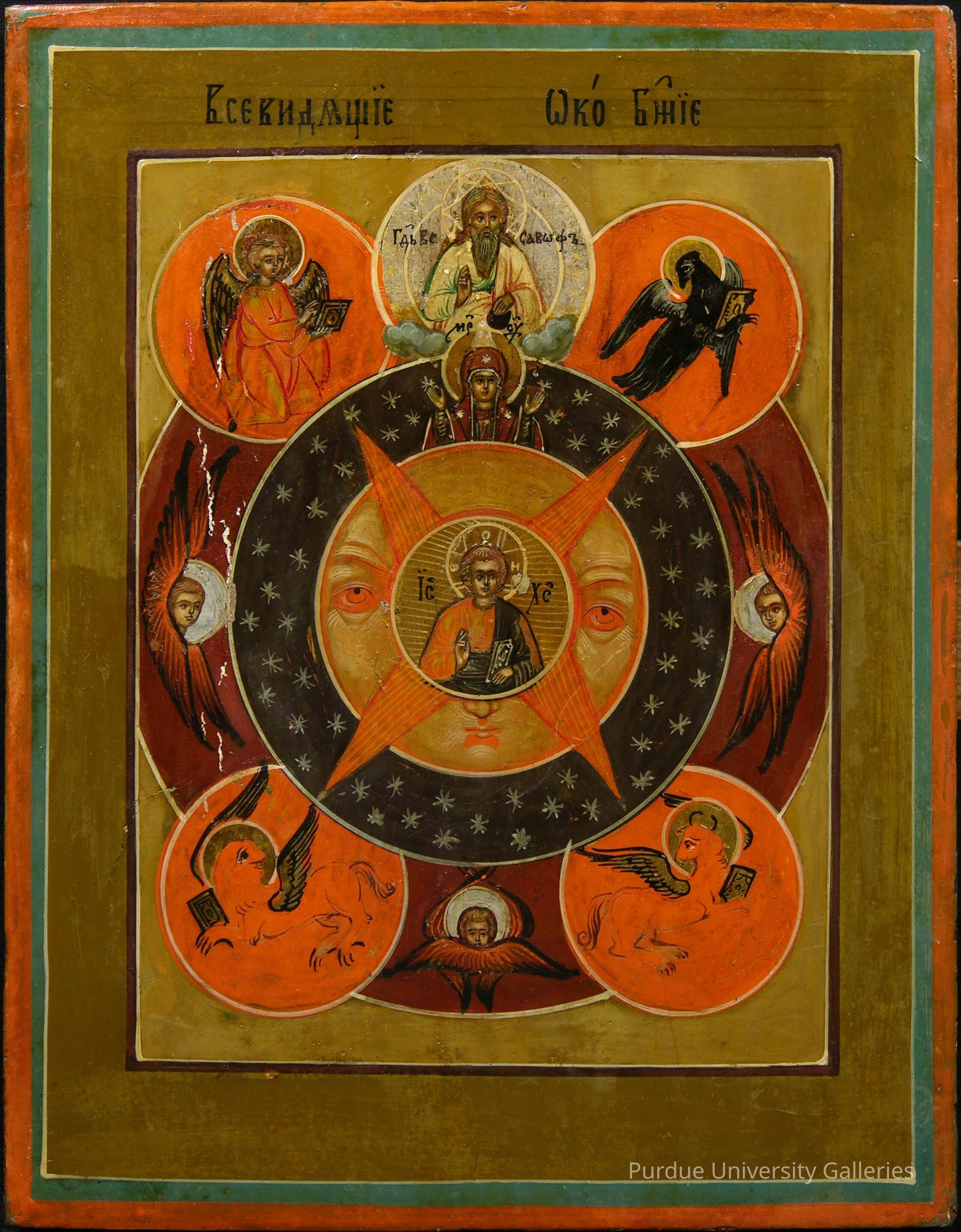 Tempera on curved wooden panel with red, teal, mustard, and brown border before lowered central image. A black Cyrillic caption sits at the top. The central image features a clean shaven figure in the middle (Christ) with three finger blessing gesture and gospel. Around him is a four pointed star then two eyes, a nose, and closed mouth in flesh colored circle around it. the next circle features silver stars on a dark border with the virgin at the top. Attached are five spheres: A white bearded figure in the clouds at the top, followed by an eagle, a bull, a lion, and an angel (symbols of the four Evangelists). The outermost circle pictures three angels with wings and faces only on red background.Type of Painting