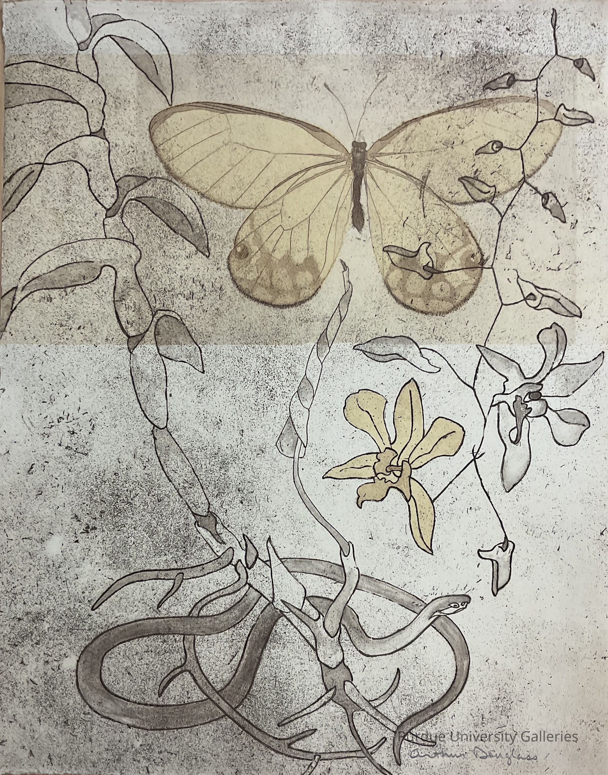 Print on heavy paper which includesa butterfly at the top and a snake at the bottom. They are surrounded by flowers and plant stems and leaves. The snake encircles a plant stem and its roots with a leaf starting to come out above the snake. A vining flower is to the right of the print. At the bottom of the print printed in pencil near the snake's tail is the artist's signaure "Arthur Douglass." On the reverse at the bottom of the paper printed in pencil "15/20, All That Crawls, flies, swims, walks or is motionless, Arthur Douglass, 2007."Type of Print