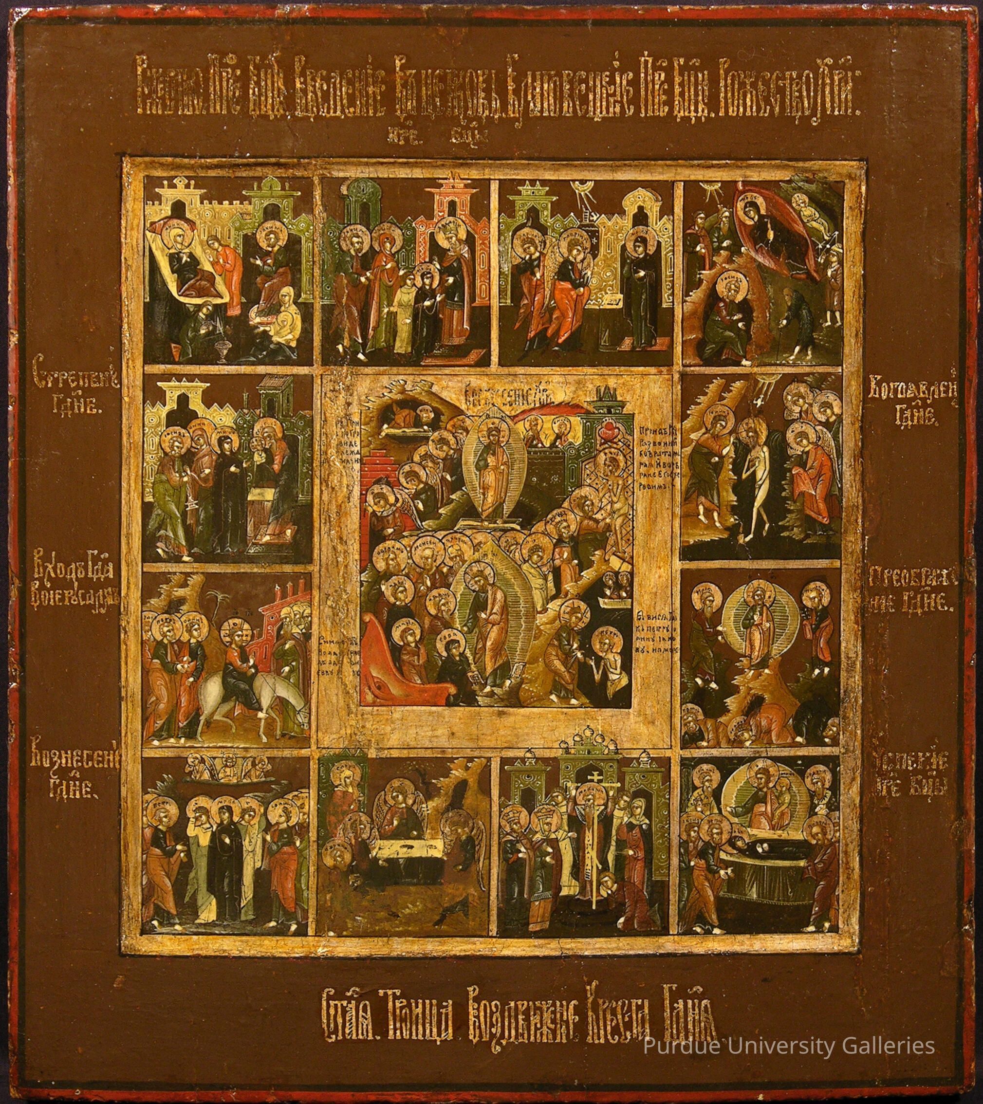 Tempera on curved wooden panel bordered in maroon and black. Gold Cyrillic captions are located at the top, bottom, and 3x on each side of the lowered central image. The largest image in the middle shows a variety of scenes with Christ shown three times (forward facing, facing the left, and bent over facing the right) clothes in light brown-pink robe over a gray-green tunic. The head of a red fish is in the lower left corner. Surrounding this image are twelve other miniature paintings depicting scenes in Christ's life.Type of Painting