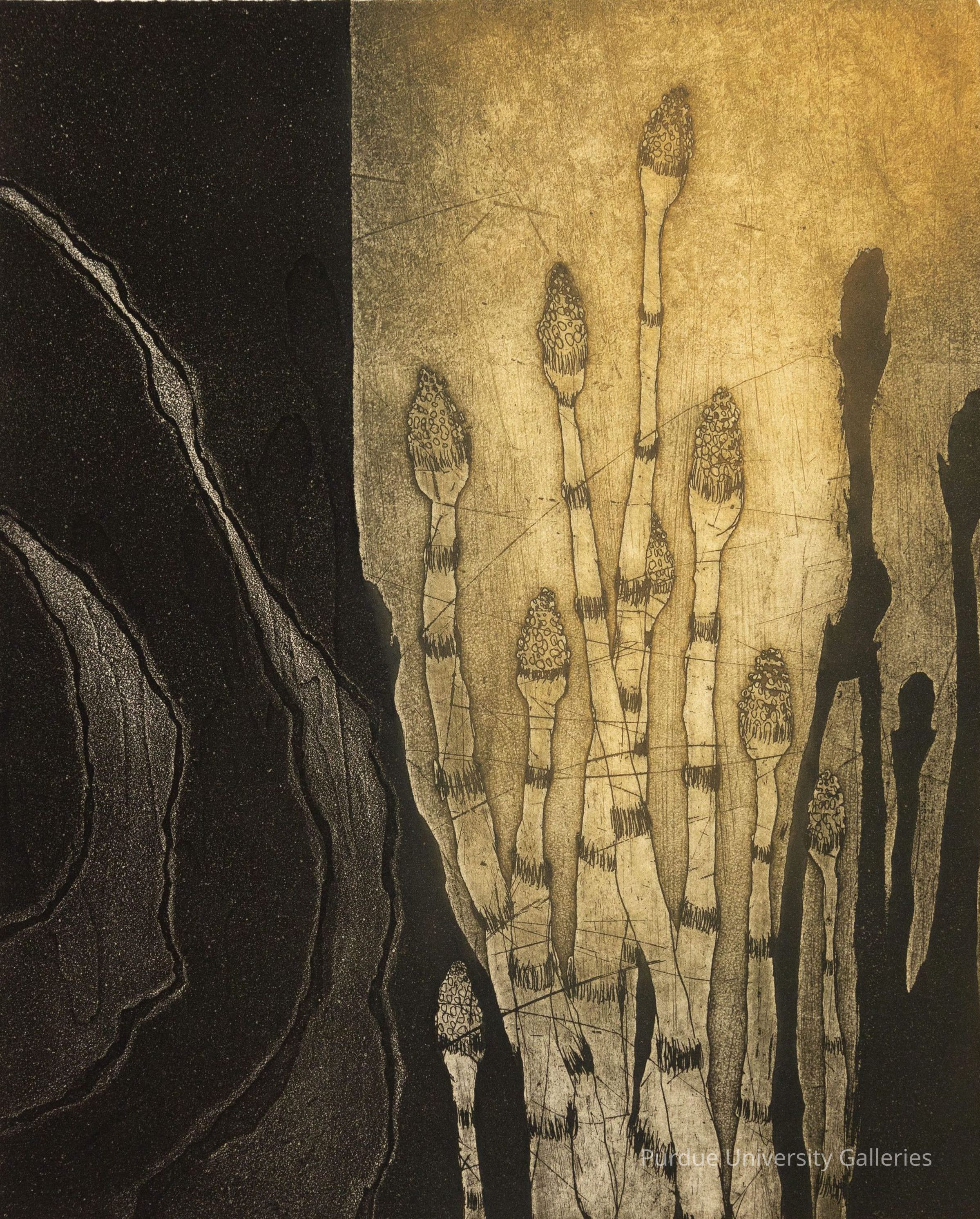 Intaglio print of what looks like either 13 stalagmite or asparagus crowns. Nine of them are detailed and 4 are in black shadoes ( to the far right of the print). To the left in black and gray the print has a 2 circular formations extending from the top left edge of the paper to the bottom left corner. On the back of the paper along the bottom edge in pencil is written "Aquifer Seep, 9/20, Cerese Vaden"Type of Print