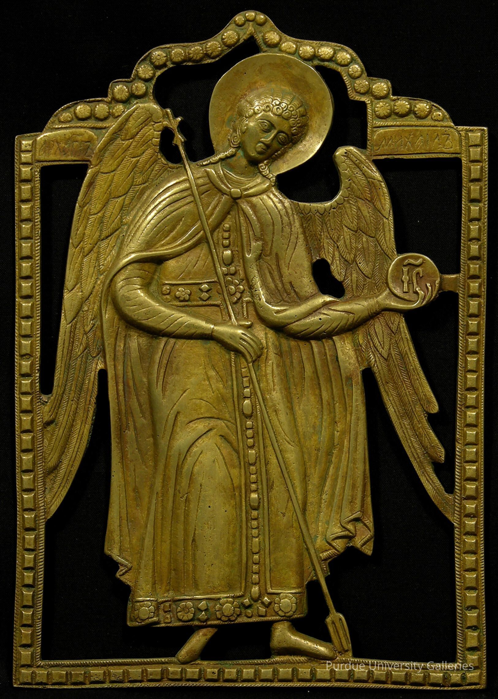 Cast bronze icon of the Archangel Gabriel. The icon shows a winged, clean shaven man with long curly hair. His head is inclined to the left and he is clothed in a long tunic and cloak. In one hand, he holds a scepter and in the other he holds an orb with the "IC" of Christ's Greek initials. On the reverse is a sticker left from the sale of the piece. This exists as a pair with 2005.02.124, and the two would have been hung on either side of a Deesis icon.