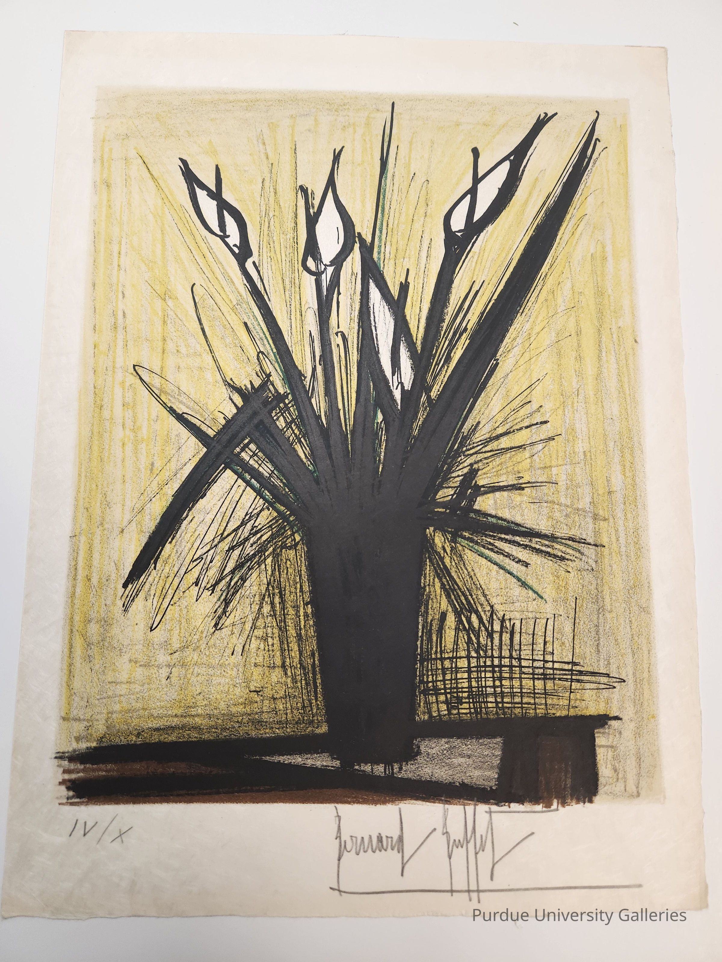 Arums is a recent find for the collection. Last month Purdue Galleries Director Erika Kvam was contacted by Professor Christine Schertz in the Department of Chemistry letting us know that they had a Bernard Buffet print in their department from an old art lending program and that it had to be removed from the wall because of renovations. After being transferred to Purdue Galleries collection space, it was removed from its frame, catalogued, condition reported, and is now resting in storage since the longer a work on paper is on display, the longer it should be put away to ensure that there is no damage from light. The general rule of thumb for a fine art collection is works on paper and other delicate objects such as textiles should only be on display for three to six months and then rest for up to three years depending on the material. While the Buffet rests, there are still dozens of paintings and prints hanging in public spaces around campus, so next time you are walking through Purdue’s halls or visiting offices look around and you might see some wonderful pieces for you to enjoy.