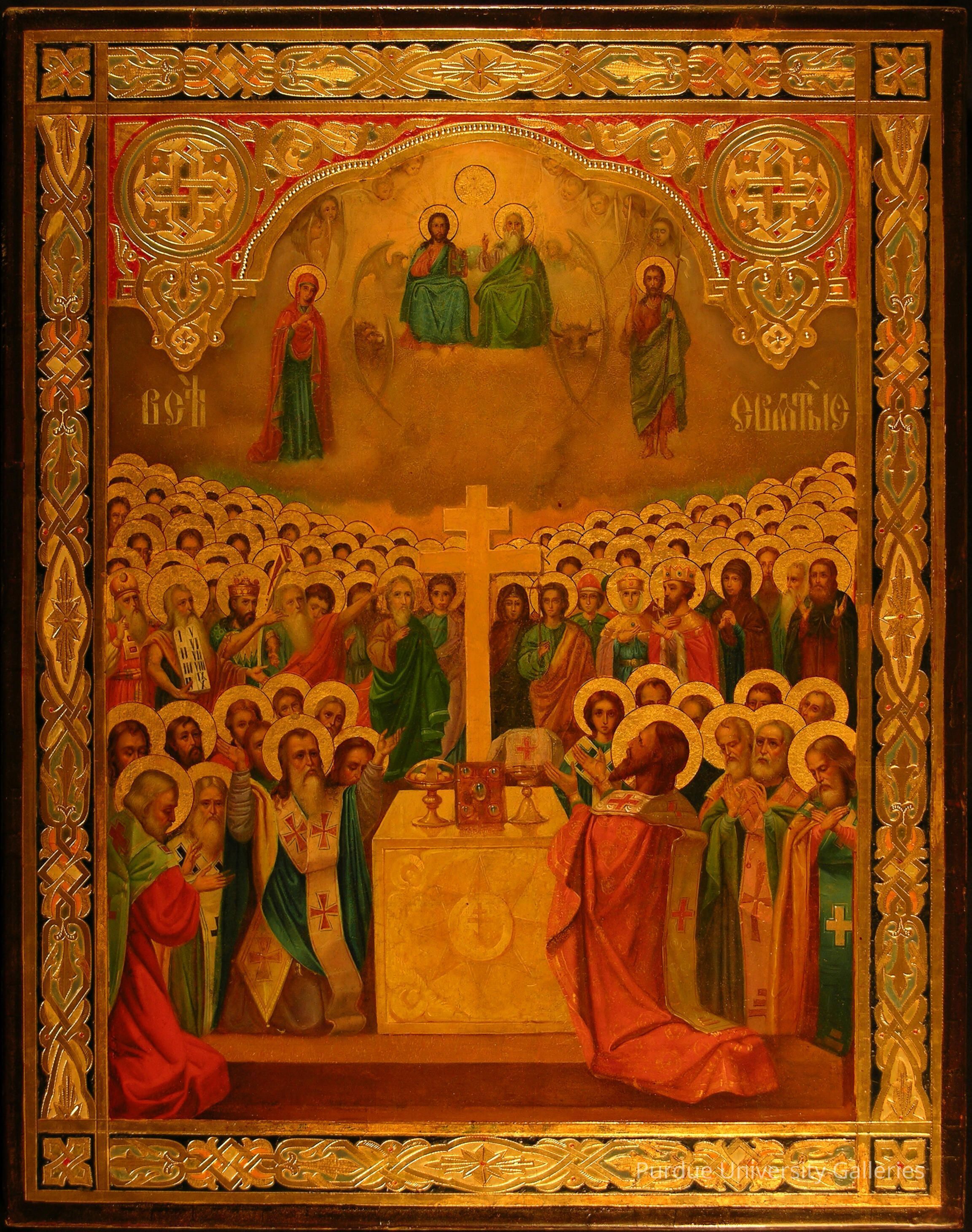 The official saints recognized by the Eastern Orthodox Church based in Constantinople were already numerous by the time Prince Vladimir of Kievan Rus adopted Orthodox Christianity in 988. Russian saints were gradually added to the Holy List beginning with Vladimir himself, his grandmother Olga, and two of his twelve sons, Boris and Gleb. This icon depicts the glory of all of the saints in the hierarchy, with the Trinity of God the Father, God the Son, and the Holy Spirit visible at the top. The symbols of the four Evangelists flank this central group, and the Mother of God and St. John the Baptist stand at the sides in the clouds. All of the saints below stand and kneel around a large cross on an altar. The altar holds a chalice covered by a veil (pokrov) for the wine, a paten (diskos), with its star-cover (asteriskos) for the host of the Eucharist, and a Gospel book in the center. Some of the figures in the left background derive from the Old Testament: Moses with his tablet and David with his harp. This icon shows the influence of western style in the rounded modeling of the faces and the use of perspective in the spatial illusion. The colors are vivid and the quantity of gold is dazzling. One figure in the left foreground lacks a halo.