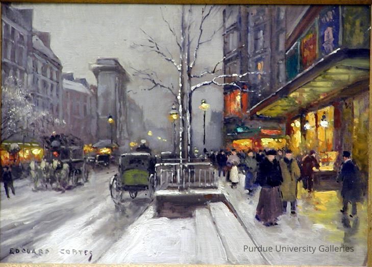 A bustling city street is depicted in the wintertime. Masses of people walk along the sidewalk, as horse and carriages crowd the busy, snowy street. The piece is bisected with the divide of trees and lanterns in the center of the painting. Buildings and illuminated store fronts line either side of the streets. The artist uses a very muted color palette, and the use of different greys throughout the piece, especially at the horizon, gives the appearance of a nebulous day in the city in the late winter. The inclusion of warmer tones like the yellows, greens, and reds of the shops illuminate the piece, and contribute to the contrast between the light from the shops and the shadows from the gloomy outdoors. The people furthermore are given no attention to specific characteristic, rather they anonymous images passing along each other on the street. The piece is very well balanced, and the overall composition is marked by the color, and the depth which is created with the use of one-point perspective, and the overall style of the painter. The painter has a very impressionistic style, which is seen in the dabbling of pure colors throughout the image rather than smooth strokes of paint. The surface because it is done in oil is shiny and has been treated with some sort of over glaze.Type of Painting