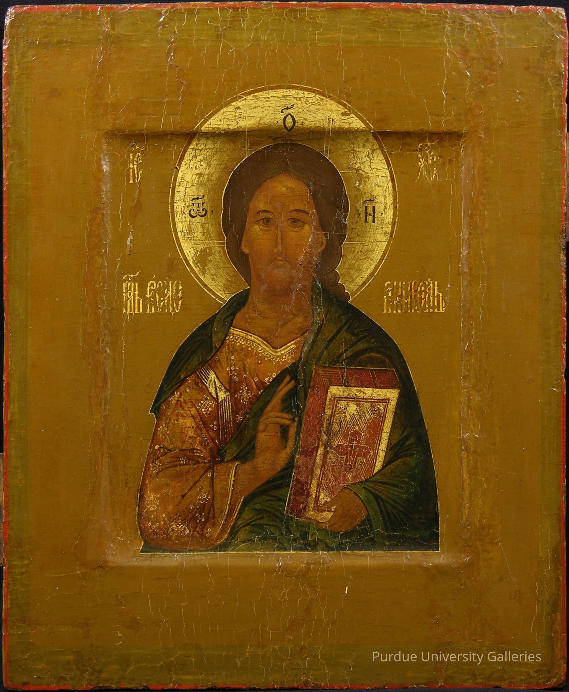 Christ Pantocrator is one of the most common images in the Eastern Orthodox faith. The image is meant to portray Christ as the Ruler of the universe and has parallels in mosaics decorating the domes of churches; in these depictions Christ often has a stern and formidable appearance. However, in the more intimate format he usually was depicted in a gentler and more compassionate manner. Typical of Pantocrator depictions this icon shows Christ holding the New Testament with his left hand as he makes a sign of blessing with his right. The position of the fingers in his right hand is particularly important. The thumb, fourth finger, and little finger are bent together symbolizing Christ’s human and divine nature. The forefinger and middle finger are held upwards, slightly bent. This gesture denotes that the icon was made in the “Old Believer” form; another form, the “State Church” form, was instituted as a result of a schism within the Russian Orthodox Church in 1667. Another feature typical of Pantocrator images seen in this icon is its use of color. Christ wears a blue himation (cloak) symbolizing the mystery of his divine power, while his red tunic signifies the blood he shed for mankind.