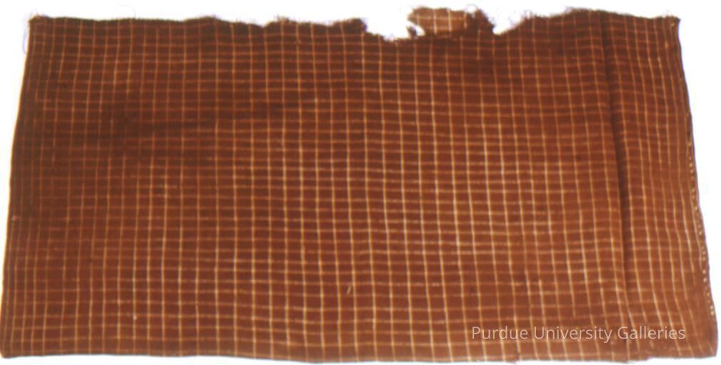 Portion of bag with warp and weft stripes in brown and cream.