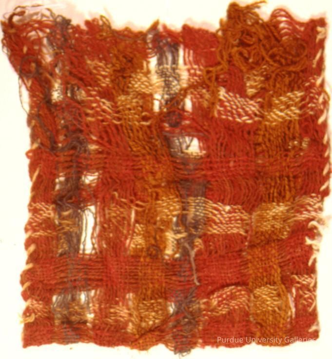 Bag in plain weave technique with plaid patterning in red, blue, white, brown, and gold. The brown has almost completely disappeared, leaving blank spaces.Acquisition