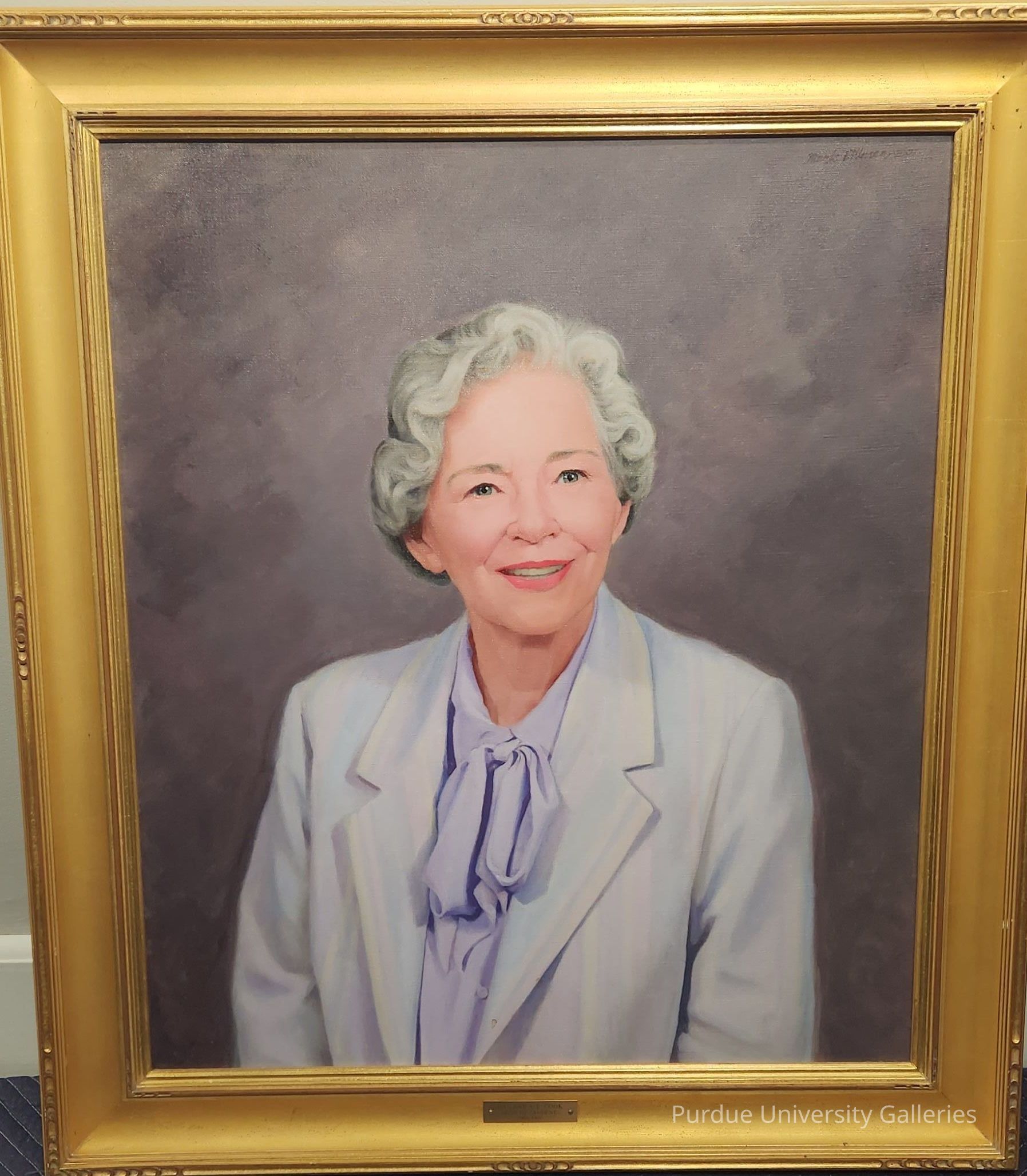 Oil painting of Barabra Ivy Cook, Office of the Dean of Women/Dean of Students (1980-1987). She is seated facing the artist, smiling, while wearing a blue/lavendar blouse that is tied at her neck, an open jacket is over this which contains pastel colors of blue and a hint of lavendar. Her hair is short. The back ground is a gray, cloudy shade.Type of Painting