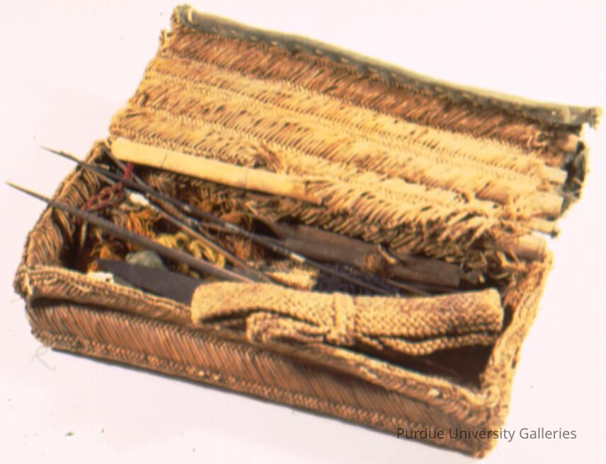 Weaving basket. Contents were probably not part of the find but assembled later. Contents include cabuya backstrap, two weaving swords, tan spindles, two balls of cotton yarn and assorted alpaca yarns.Acquisition