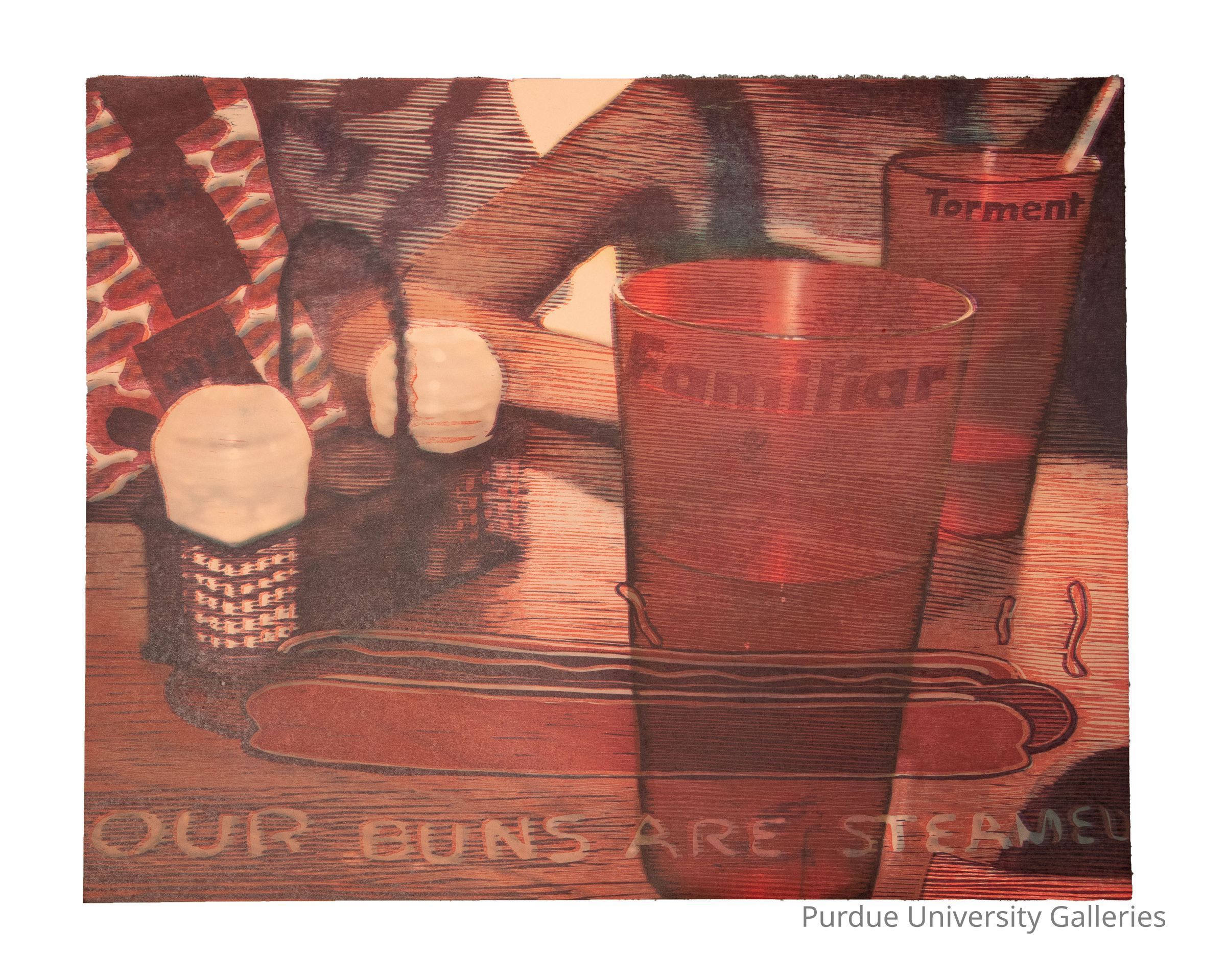 Print on cardstock of table setting that includes a cup carrier with two white containers in it to the left and footlong hotdog in the foreground, a woman's torso in the background and tow drink glasses one behind the other labeled: Familiar (foreground), Torment (background). Along the bottom of the print "OUR BUNS ARE STEAMED." The print is red with some black outlining. On the reverse at the bottom edge is printed in pencil from left to right, "Familiar Torment." "11/20." "Benjamin D. Rinehart, '16."Acquisition