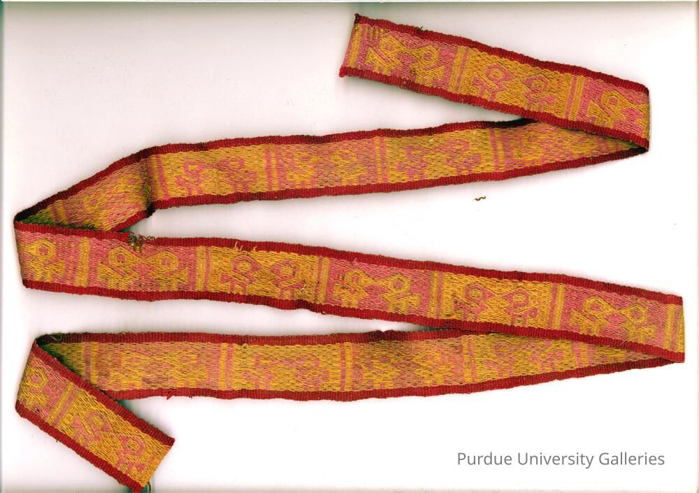 Fiber, alpaca, and cotton. Woven belt with bird motifs in warp face pebble weave. Colors include pink, yellow, and red.