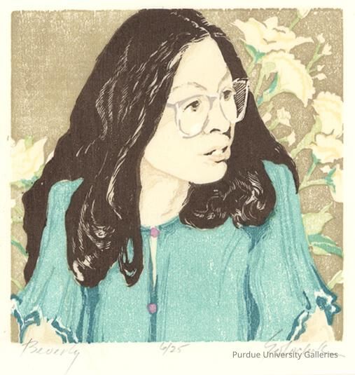 This multicolor woodcut print of a woman named Beverly is done in a carving on paper. The artist used around six colors to portray the figure. The grain of the woodcut shows through. Mark-making in the hair and glasses show shine and highlight to add to the rest of the figure.