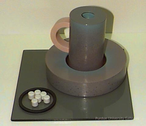 This abstract ceramic cup sits inside of a large hole in the middle of this dish. There is another ring to the left of the piece that sits small white cylinders in contrast to the thick-walled cup. The opening to the assumed mug is a small hole in comparison to the wide circle at the bottom holding the cup. The assumed handle is also thick in dimension. This piece seems as if it would be difficult to carry in one's hand due to the width of the cups and the usability of the hole in said cup.