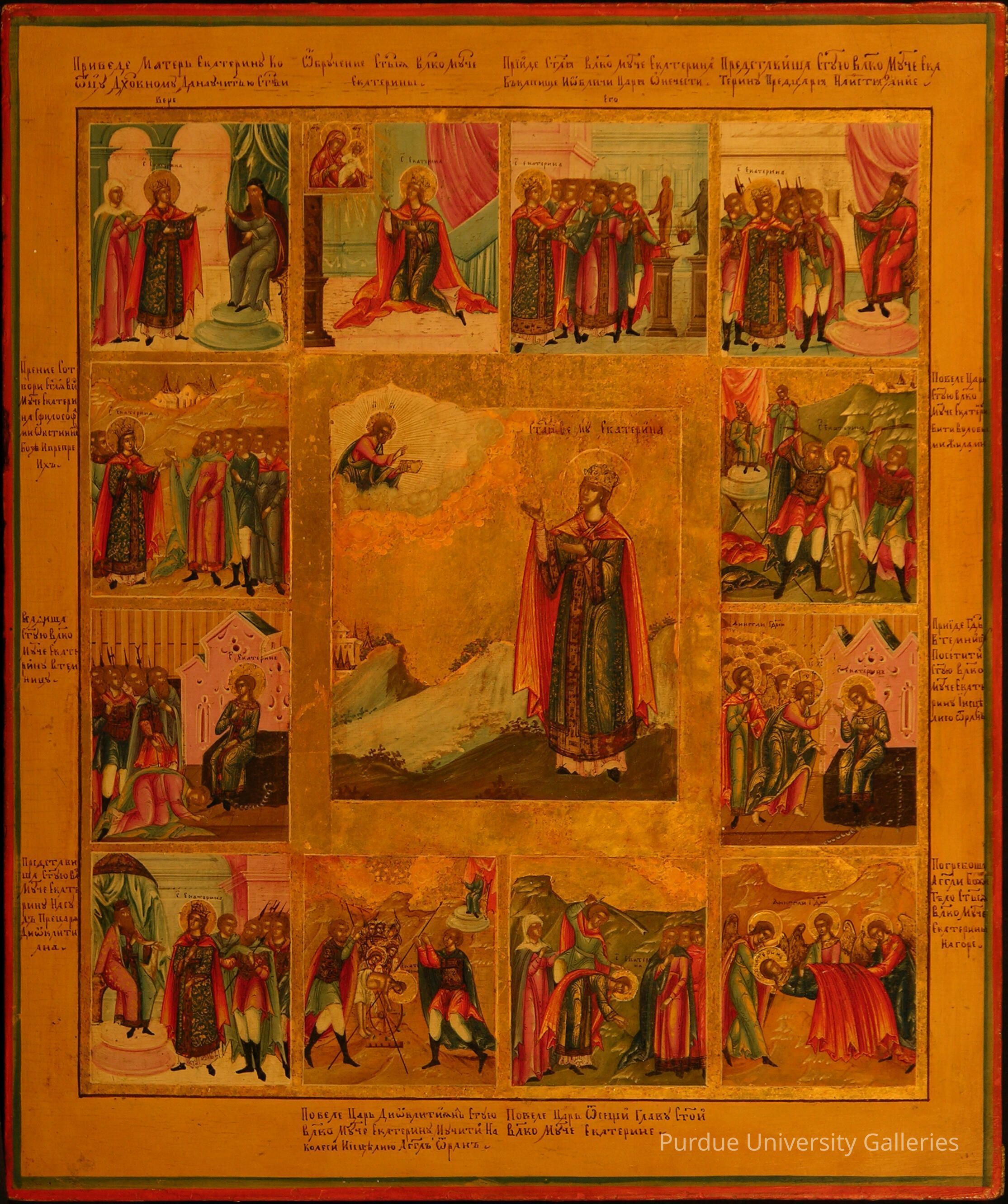 St. Catherine appears dressed as a princess with a crown and royal vestments, her hands lifted in prayer to Jesus, located above her in the clouds. She is standing in a rugged landscape with a building in the distance. The twelve scenes in the border tell the story of her life and martyrdom. According to legend, Catherine was a highly educated princess of Alexandria and a very devout Christian, who in a vision saw herself betrothed to the infant Christ. The emperor Maxentius (reigned 306-312) demanded that she renounce her faith, but she instead defeated his philosophers in argument and converted them to Christianity. Maxentius also tried to have her torn to pieces by two spiked wheels, but the wheels were struck by lightning and destroyed. Finally, Catherine was beheaded, and according to tradition, her remains were brought to the monastery at Mt. Sinai which bears her name. She is often shown with a broken wheel as her principal attribute.