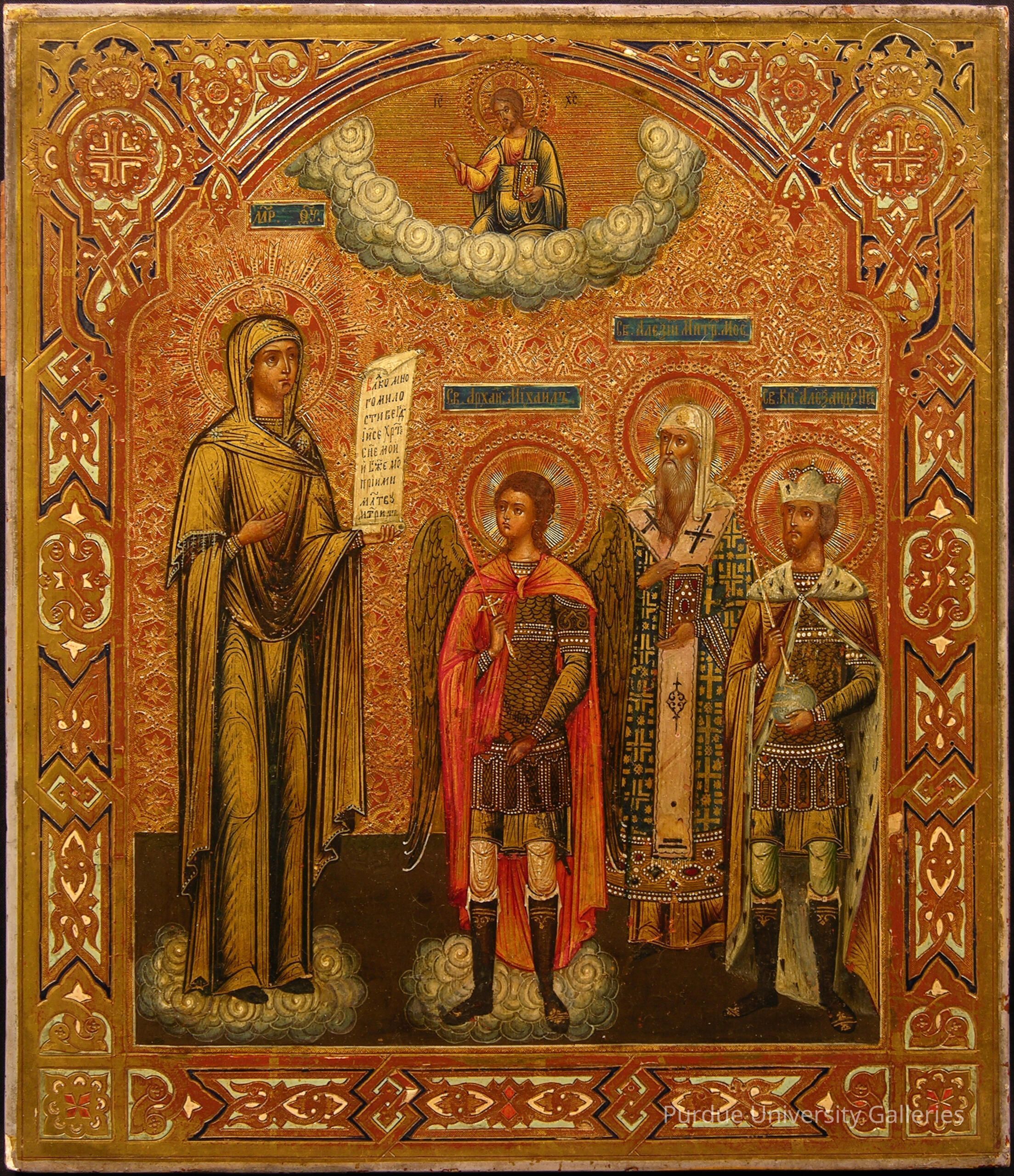 This Mother of God type refers to her appearance to the Grand Prince Andrey Bogoliubsky in 1157. (see 2005.02.028) In this version, the Virgin stands before the Archangel Michael, St. Alexy Metropolitan of Moscow, and St. Alexander Nevsky. The detailed, tangible drapery of the three saints contrasts with the more” linear drapery of the Mother of God, indicating that she appears to them in a vision. Both the Virgin Mary and the Archangel are standing on fluffy clouds, but Mary is larger in scale. She is looking up at Christ, shown in a semicircle of clouds. The border contains a complex geometric design with an arch at the top.